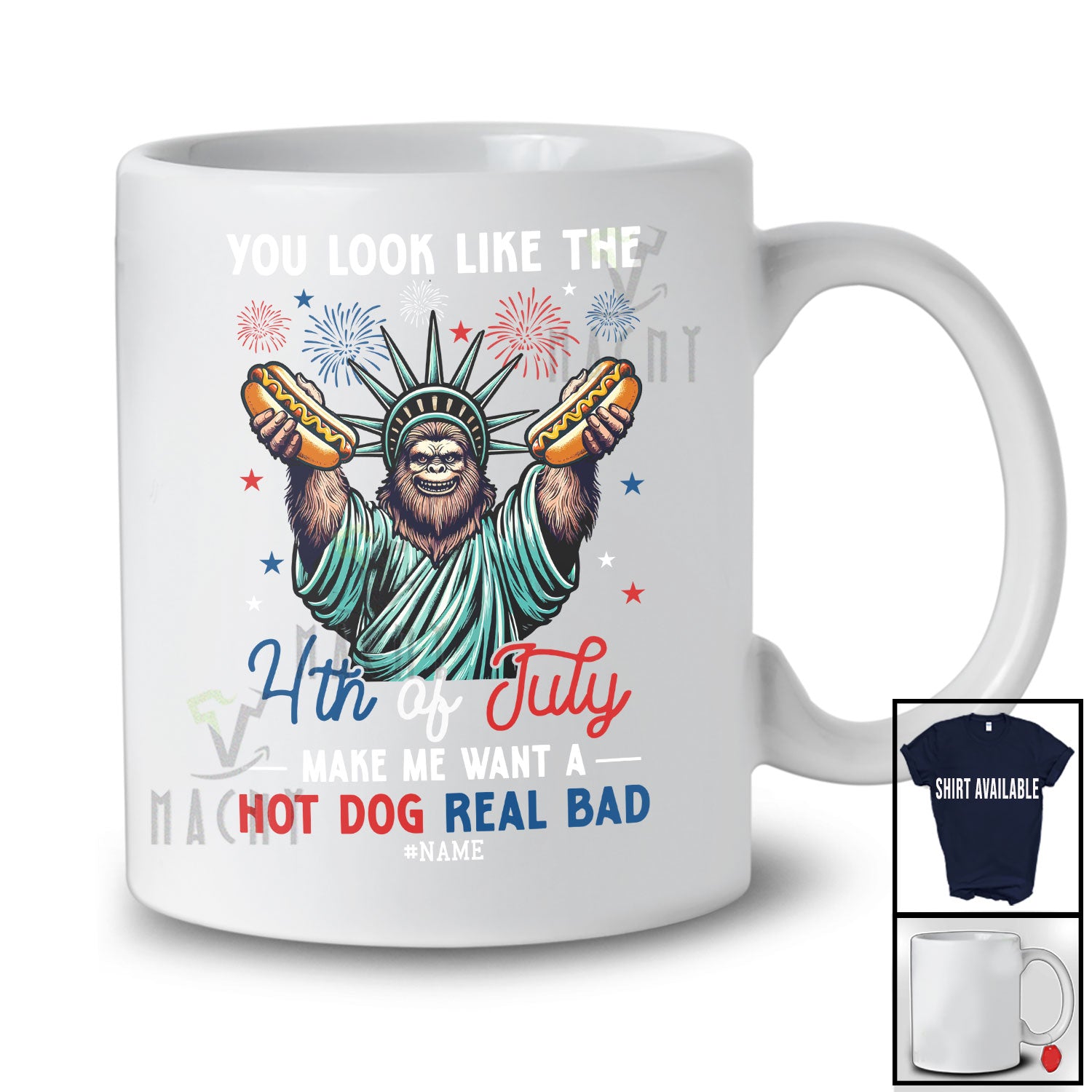 Personalized 4th Of July Make Me Want A Hot Dog; Proud Custom Name Bigfoot Patriotic T-Shirt. This cotton t-shirt is a durable staple product with a classic fit. One of the most popular items, it has a relaxed style made for everyday and casual wear.