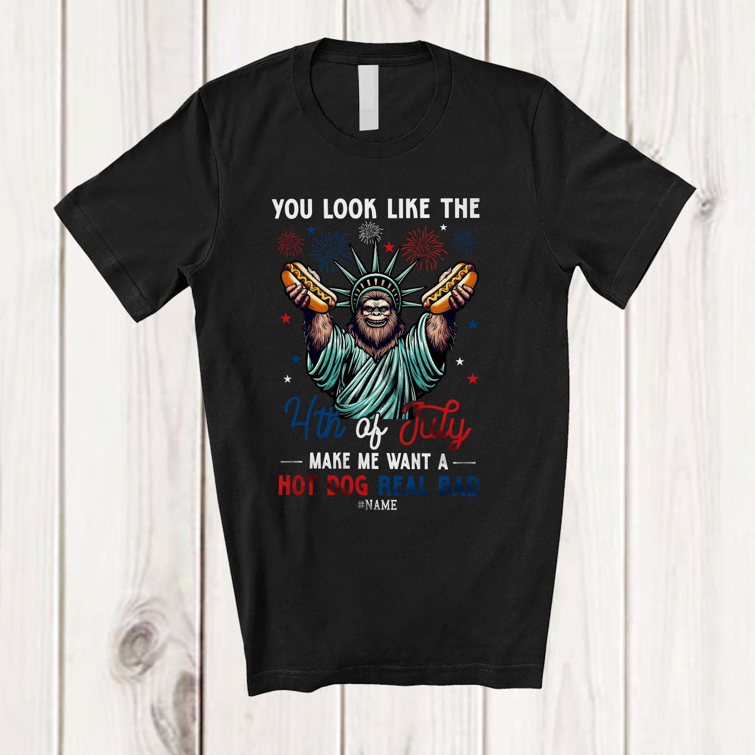 Personalized 4th Of July Make Me Want A Hot Dog; Proud Custom Name Bigfoot Patriotic T-Shirt