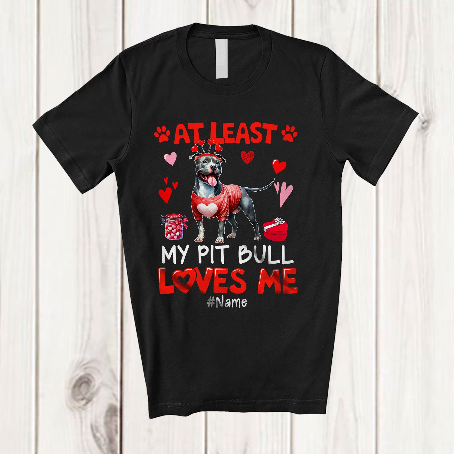 The Personalized At Least My Pit Bull Loves Me; Lovely Valentine Hearts; Custom Name Single Family T-Shirt was built with people like you in mind. Something to keep you happy. Every. Single. Day.