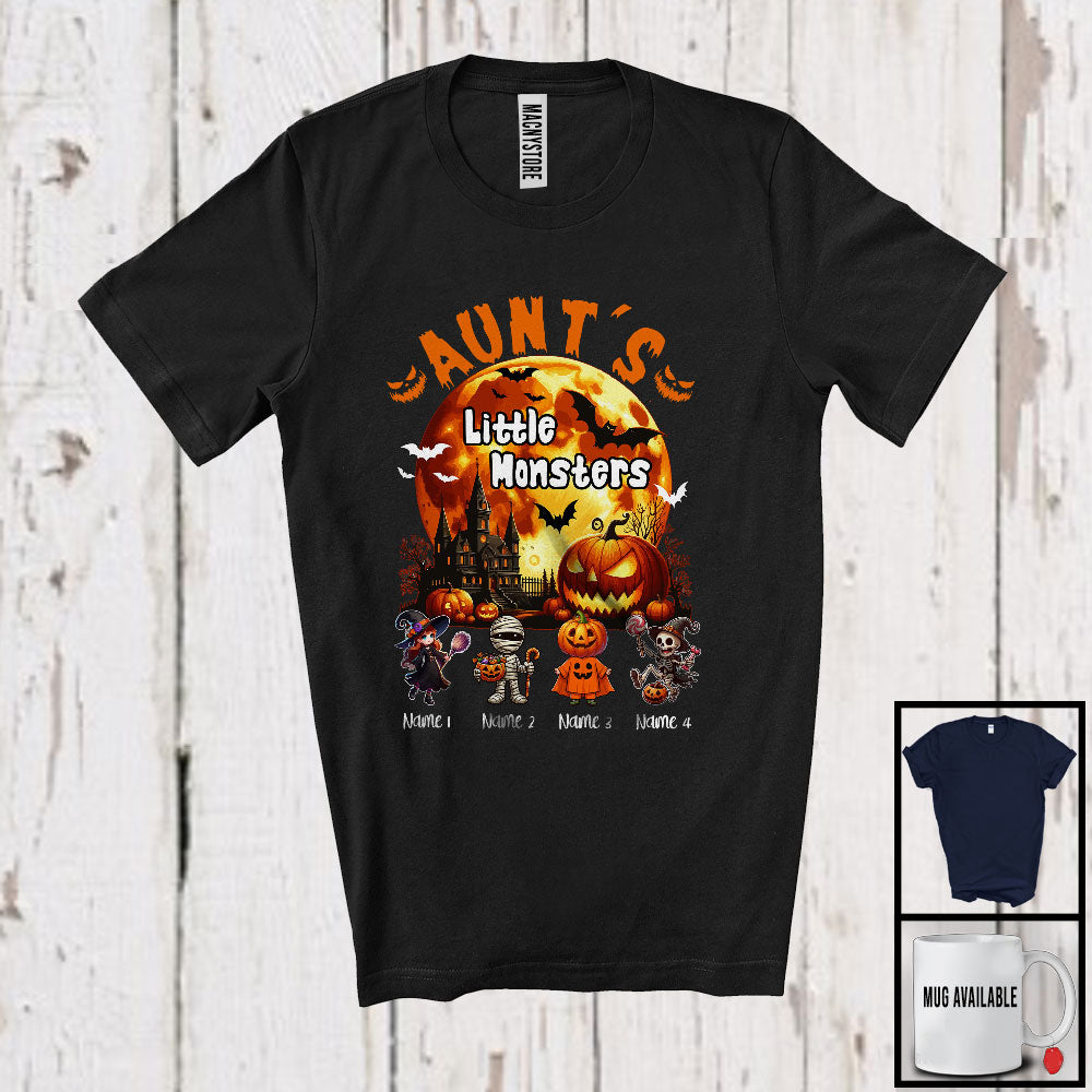 Personalized Aunt's Little Monsters, Creepy Halloween Moon Pumpkin, Custom Name Family T-Shirt