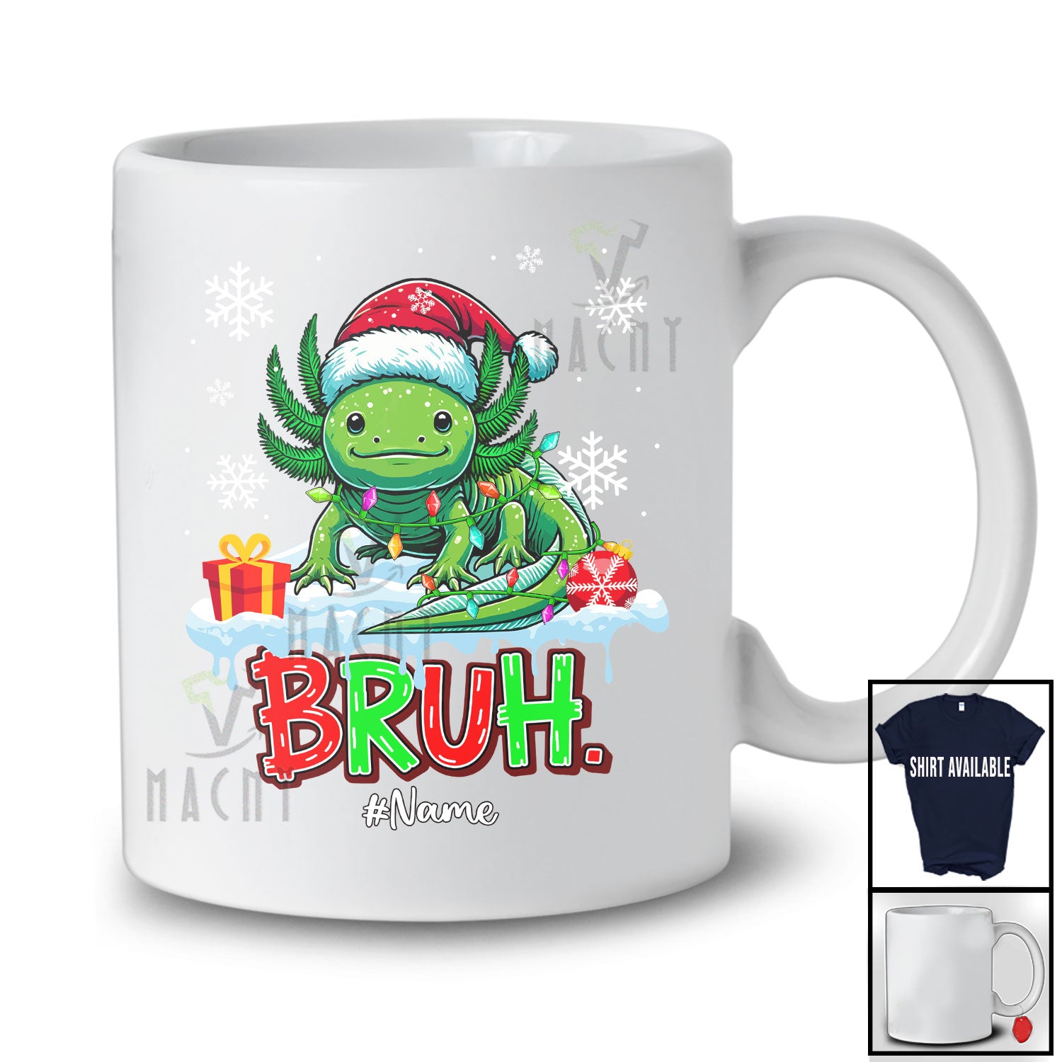• Personalized Bruh; Lovely Christmas Santa Green Axolotl; Custom Name Axolotl Owner; Family T-Shirt. This cotton t-shirt is a durable staple product with a classic fit. One of the most popular items, it has a relaxed style made for everyday and casual wear.
