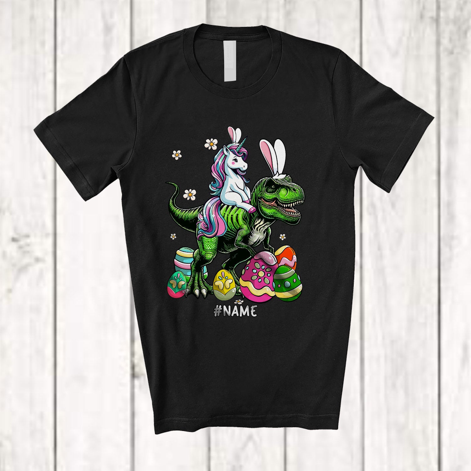 Personalized Bunny Unicorn Riding T-Rex; Adorable Easter Custom Name Unicorn Dinosaur; Egg Hunt T-Shirt