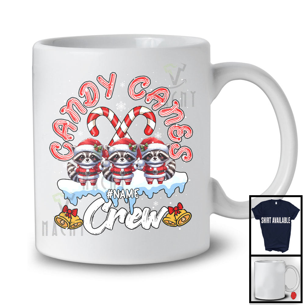 Personalized Candy Canes Crew; Lovely Christmas Custom Name Three Santa Raccoon; Snowing T-Shirt. This cotton t-shirt is a durable staple product with a classic fit. One of the most popular items, it has a relaxed style made for everyday and casual wear.