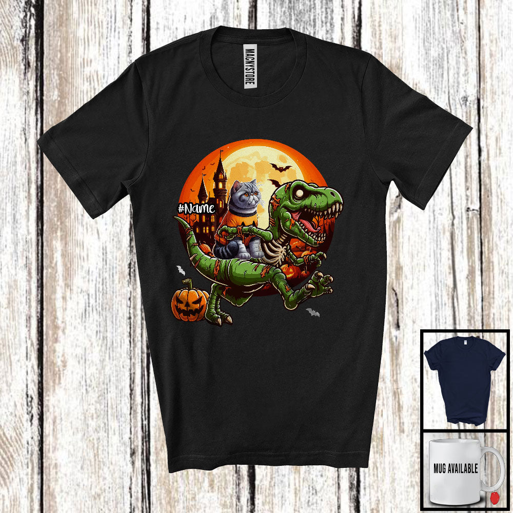 new MacnyStore - Personalized Cat Riding T-Rex Zombie; Horror Halloween Custom Name Dinosaur Lover T-Shirt – Macnystore