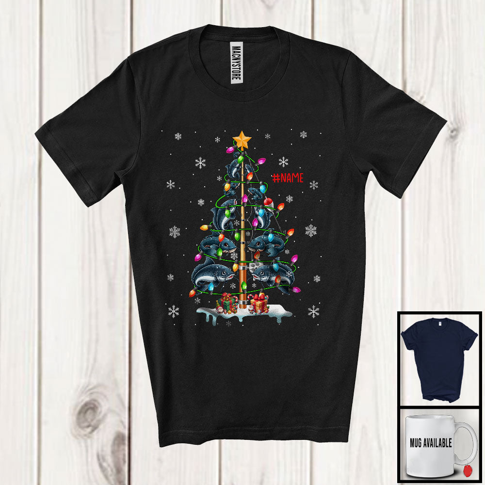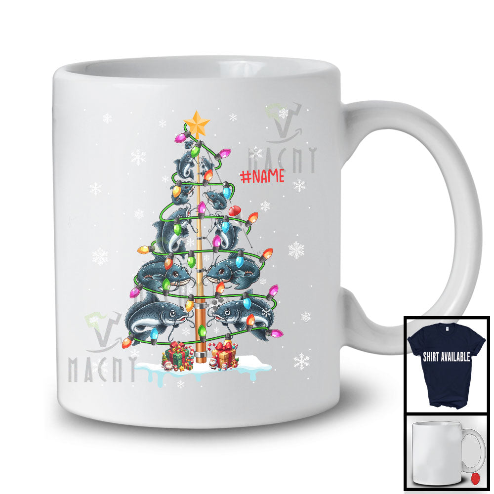 Personalized Christmas Tree Catfish; Amazing X-mas Fish Fishing Lover; Custom Name Fisher Group T-Shirt