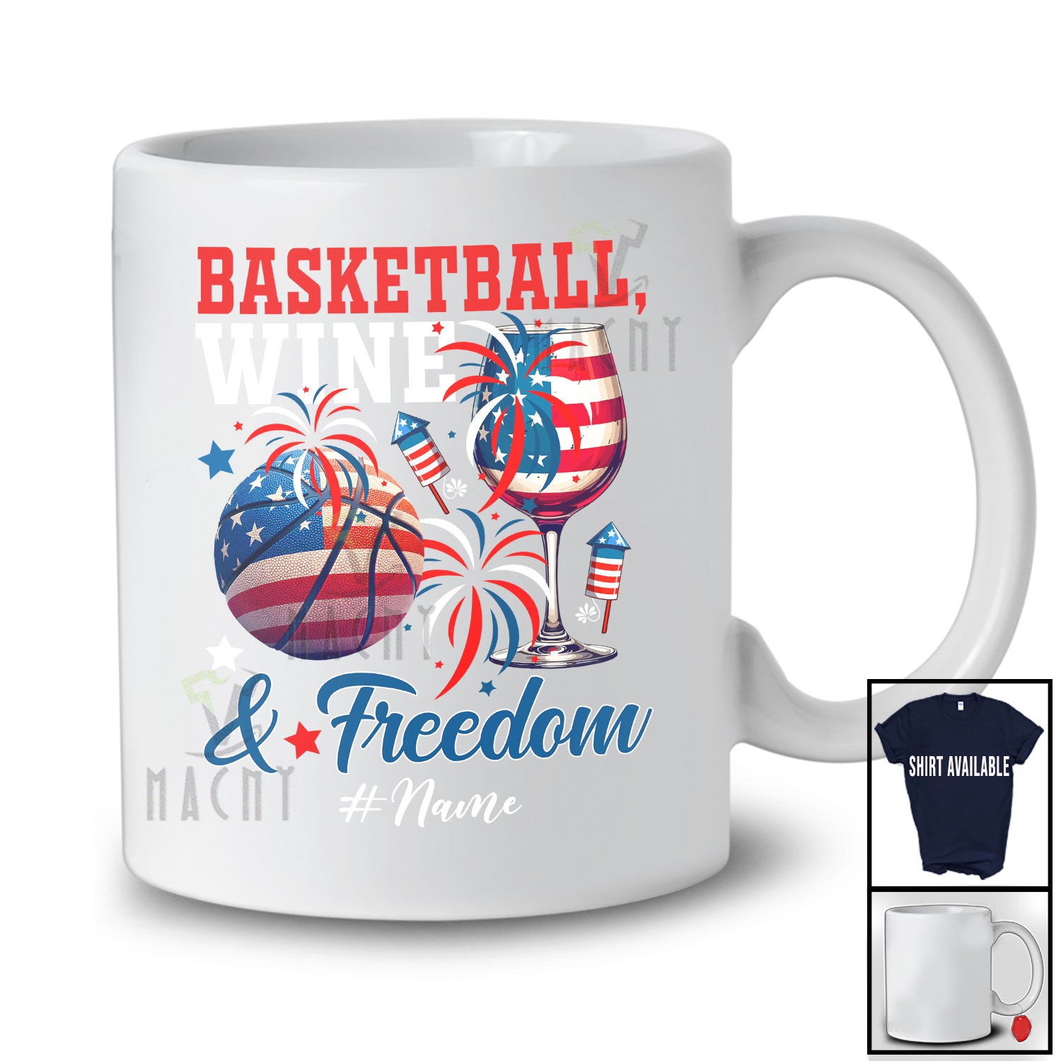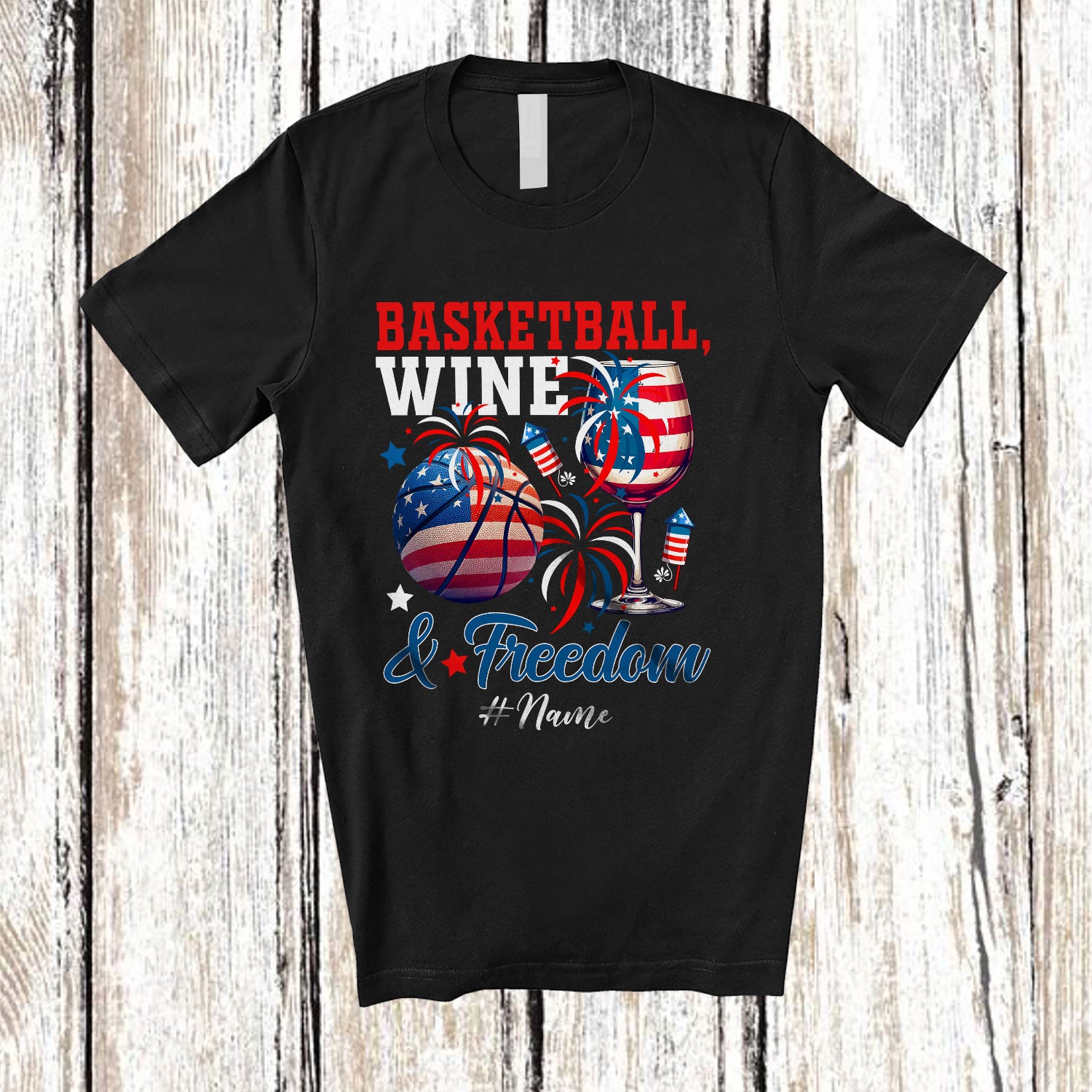 Personalized Custom Name Basketball Wine Freedom; Joyful 4th of July Drinking Player; Patriotic T-Shirt. This cotton t-shirt is a durable staple product with a classic fit. One of the most popular items, it has a relaxed style made for everyday and casual wear.