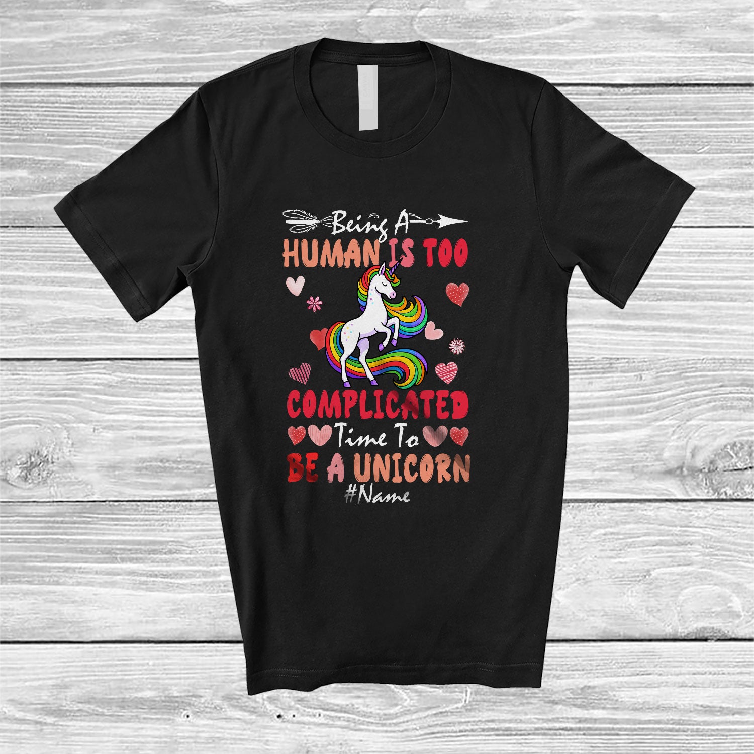 Personalized Custom Name Being A Human Is Too Complicated Be A Unicorn; Lovely Hearts Family T-Shirt. This cotton t-shirt is a durable staple product with a classic fit. One of the most popular items, it has a relaxed style made for everyday and casual wear.