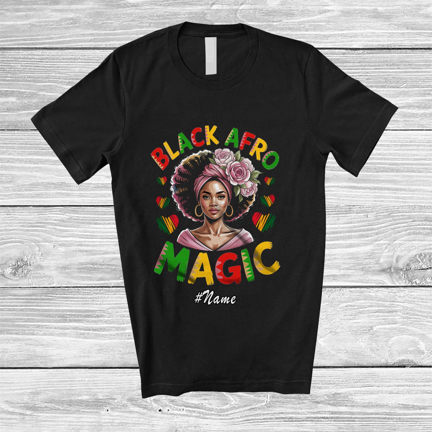 • Personalized Custom Name Black Afro Magic; Amazing Black History Month African Women Afro T-Shirt. This cotton t-shirt is a durable staple product with a classic fit. One of the most popular items, it has a relaxed style made for everyday and casual wear.