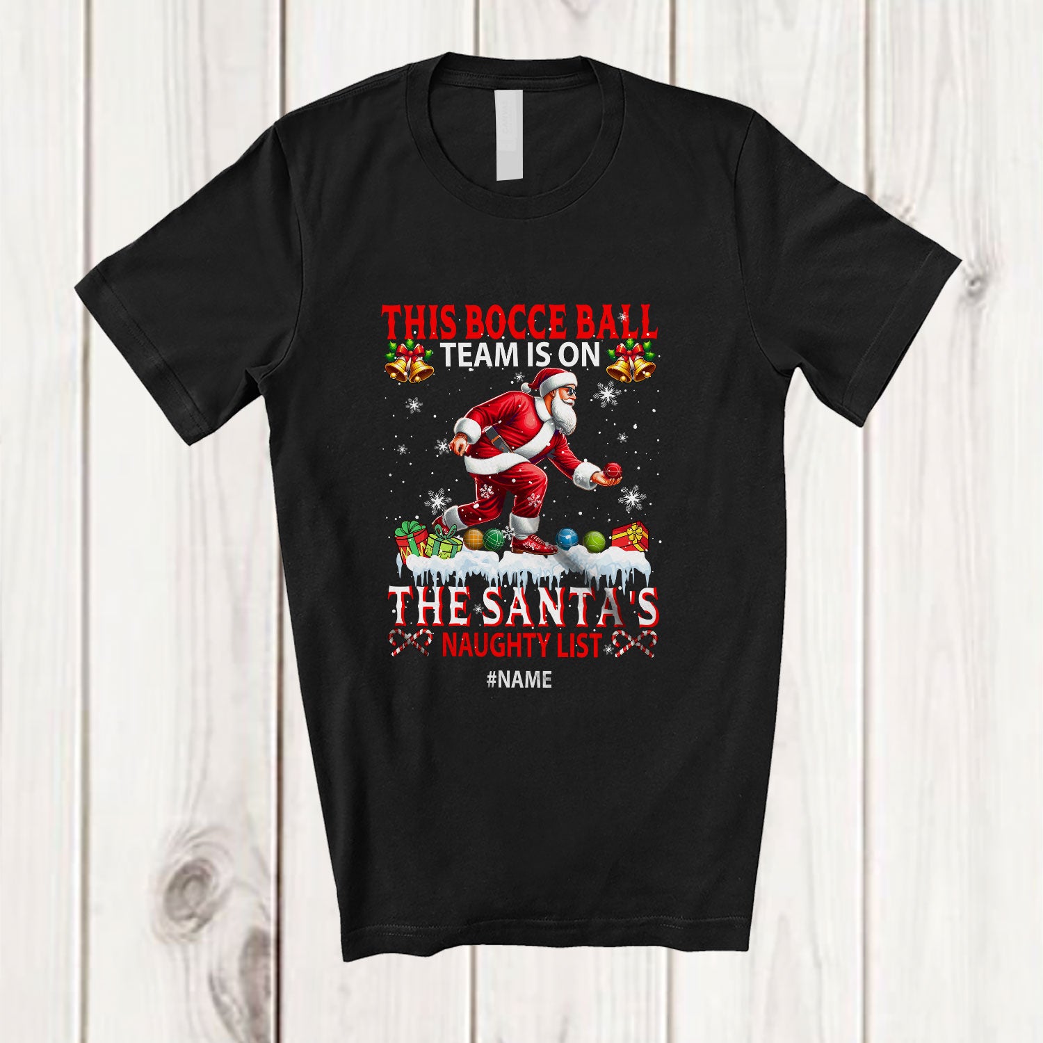 Personalized Custom Name Bocce Ball Team On Santa's Naughty List; Joyful Christmas Player T-Shirt