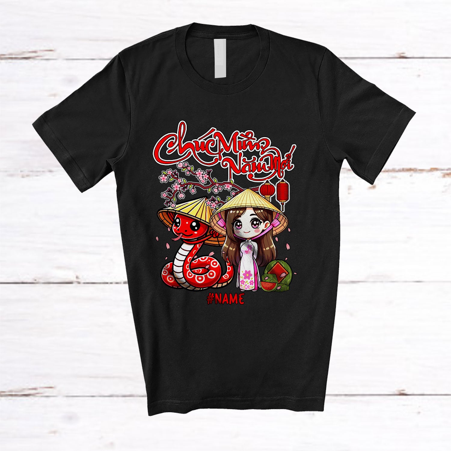 • Personalized Custom Name Chuc Mung Nam Moi; Joyful Lunar New Year Vietnamese Girl Snake T-Shirt. This cotton t-shirt is a durable staple product with a classic fit. One of the most popular items, it has a relaxed style made for everyday and casual wear.