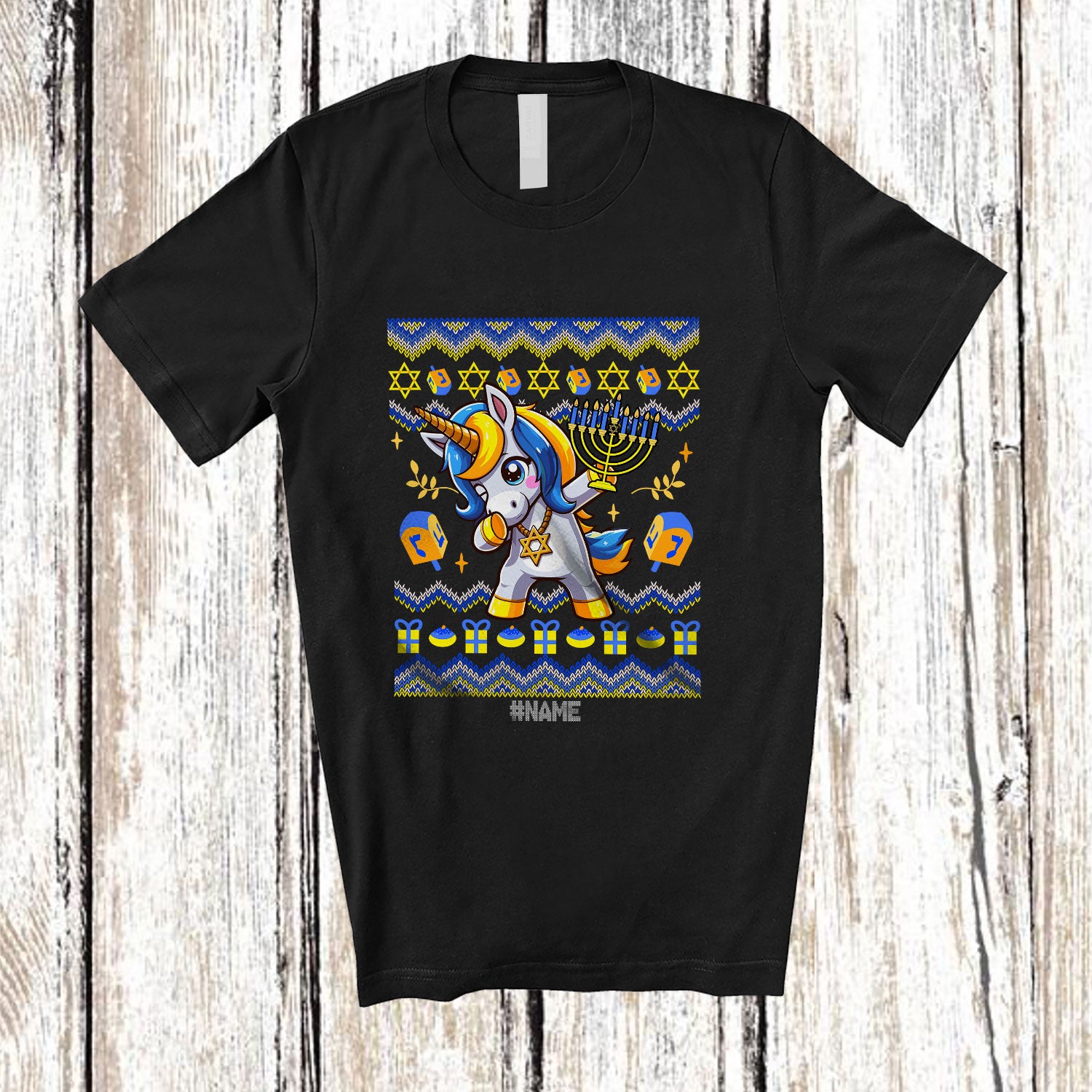 • Personalized Custom Name Dabbing Unicorn With Menorah; Joyful Hanukkah Sweater Family T-Shirt. This cotton t-shirt is a durable staple product with a classic fit. One of the most popular items, it has a relaxed style made for everyday and casual wear.