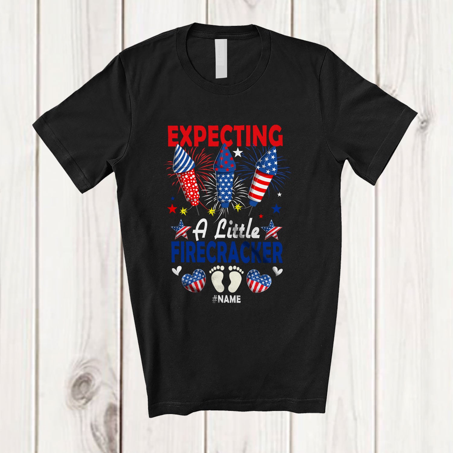 • Personalized Custom Name Expecting A Little Firecracker; Joyful Pregnancy Patriotic 4th of July T-Shirt. This cotton t-shirt is a durable staple product with a classic fit. One of the most popular items, it has a relaxed style made for everyday and casual wear.