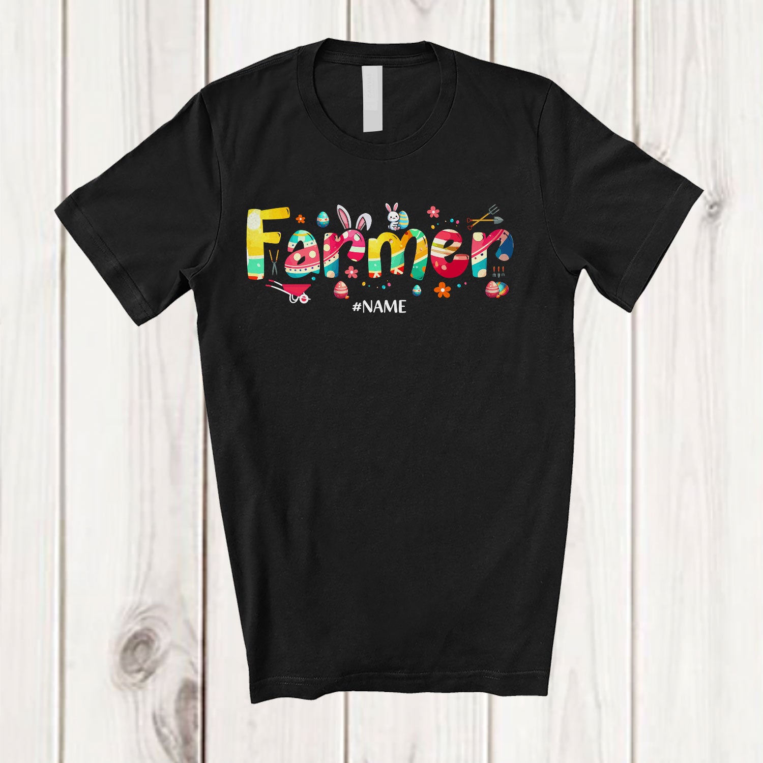 Personalized Custom Name Farmer; Amazing Easter Bunny Eggs Hunting; Family Group T-Shirt. This cotton t-shirt is a durable staple product with a classic fit. One of the most popular items, it has a relaxed style made for everyday and casual wear.