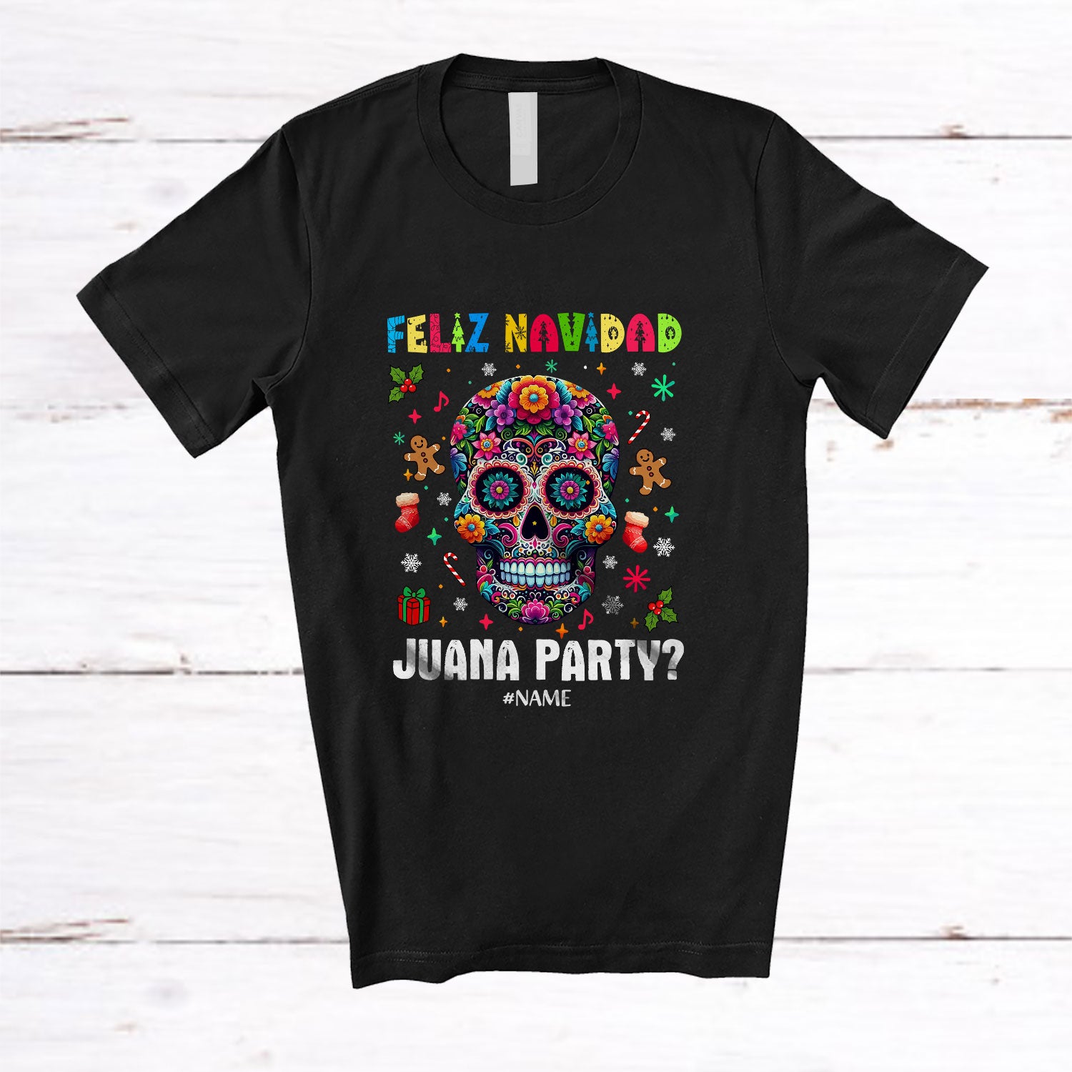 Personalized Custom Name Feliz Navidad Juana Party; Amazing Christmas Surgar Skull Mexican T-Shirt. This cotton t-shirt is a durable staple product with a classic fit. One of the most popular items, it has a relaxed style made for everyday and casual wear.