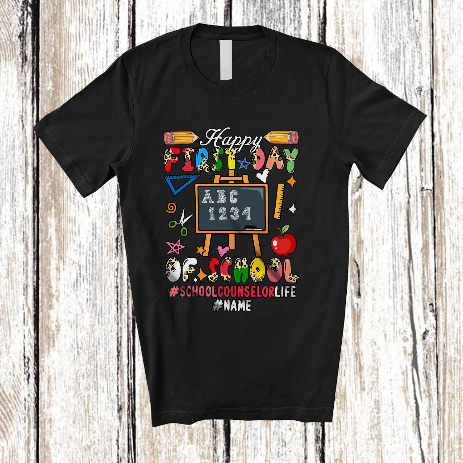 • Personalized Custom Name First Day Of School Counselor; Amusing Back To School Tools Leopard T-Shirt. This cotton t-shirt is a durable staple product with a classic fit. One of the most popular items, it has a relaxed style made for everyday and casual wear.