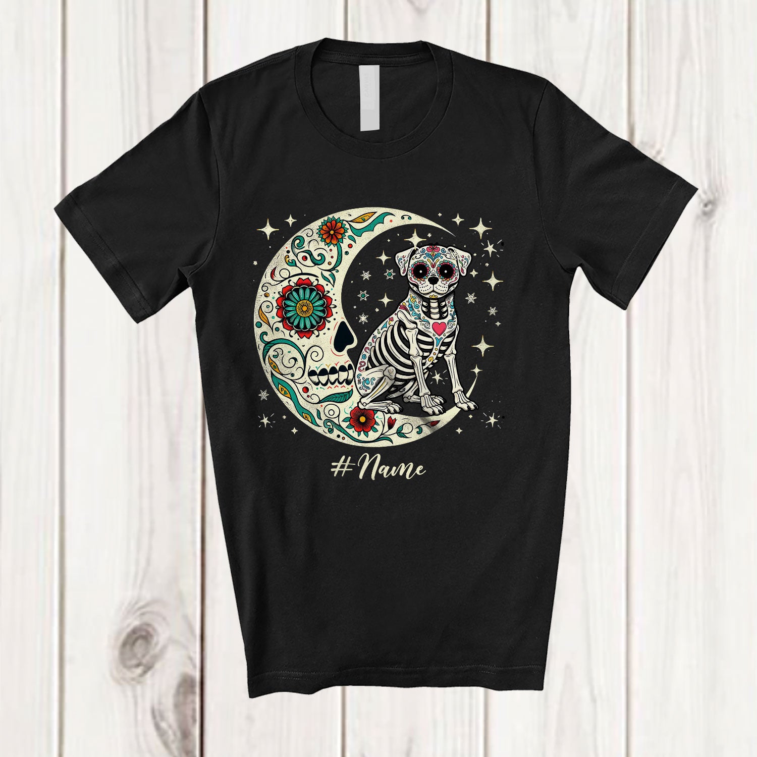 Personalized Custom Name Floral Moon Skeleton Pug; Scary Dia De Los Muertos Halloween T-Shirt