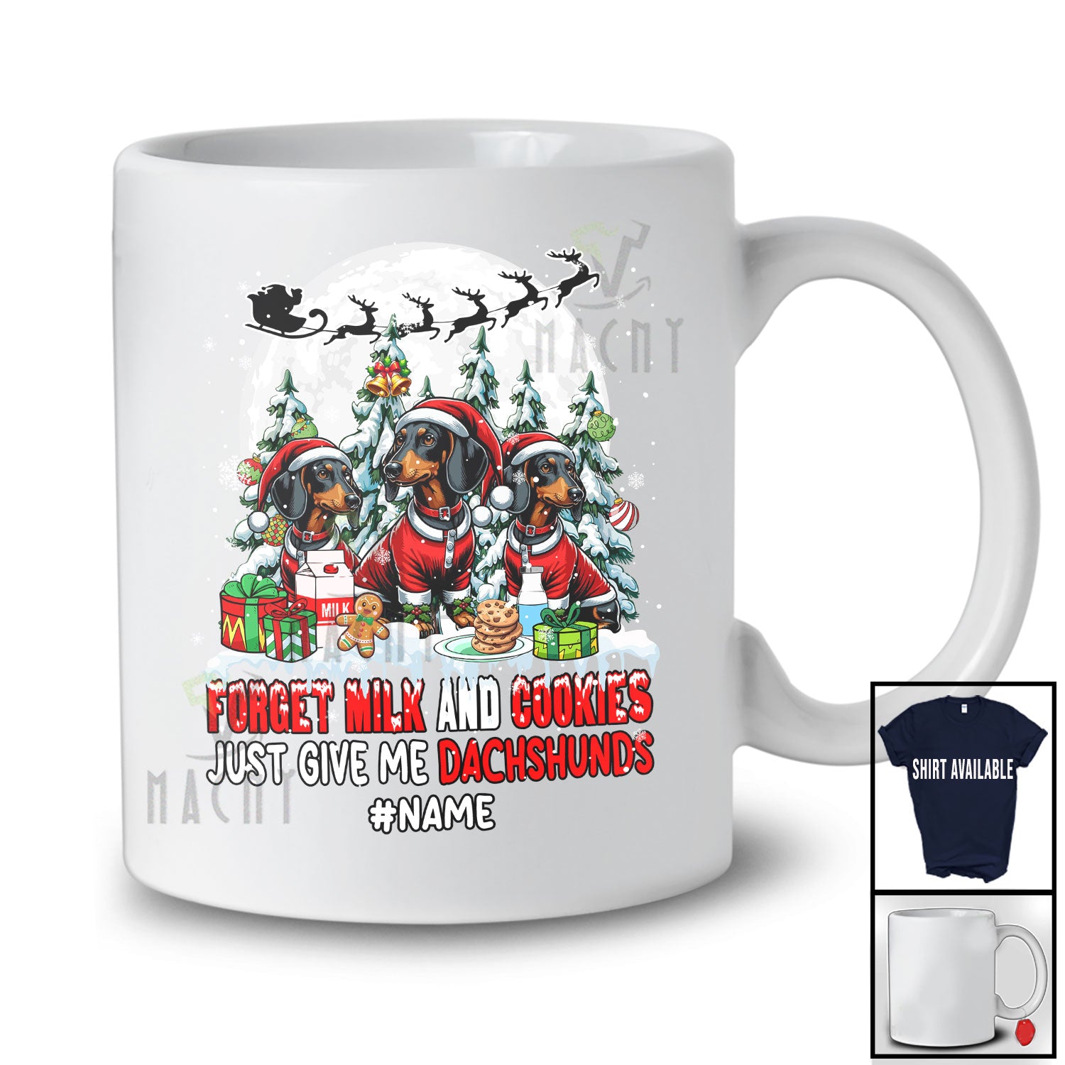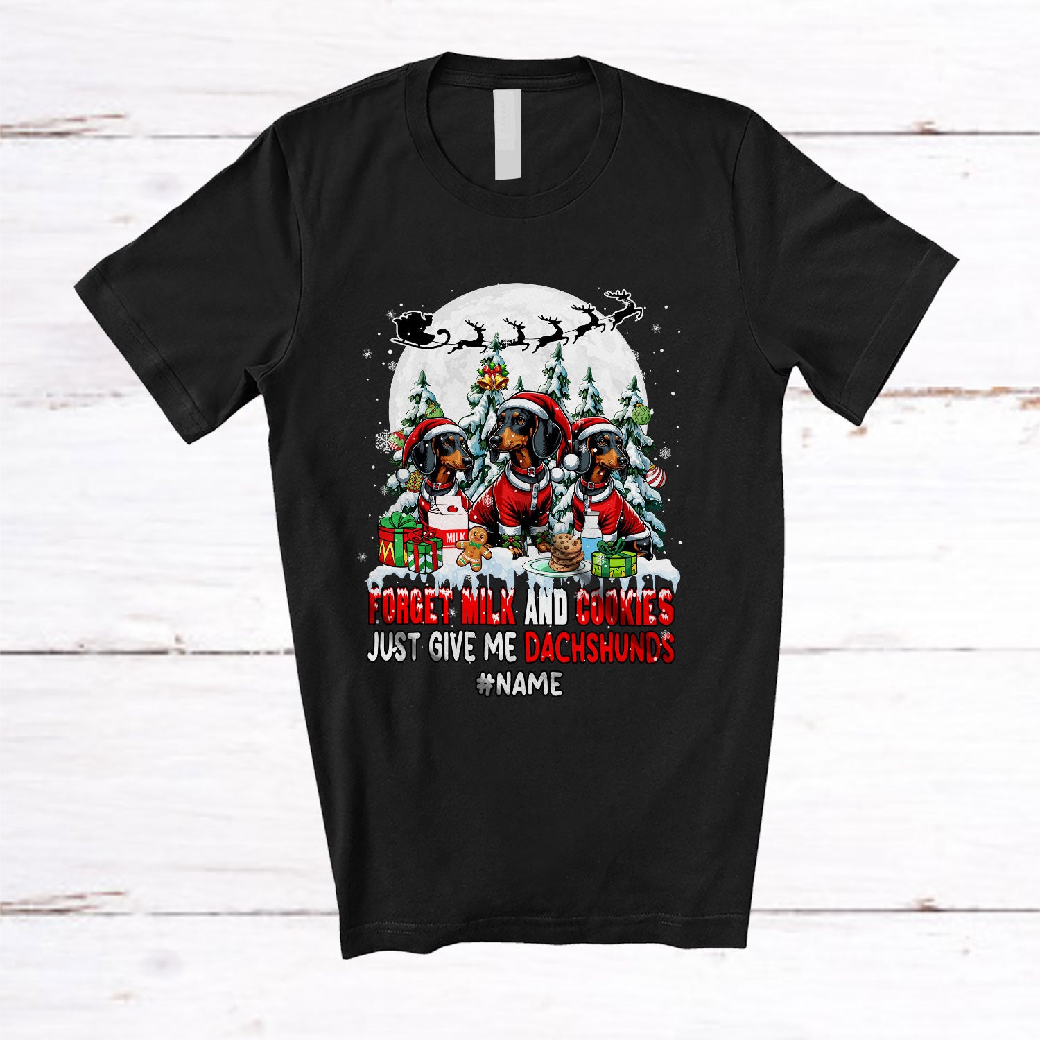 Personalized Custom Name Forget Milk Give Me Dachshunds; Joyful Christmas Three Santa Family T-Shirt. This cotton t-shirt is a durable staple product with a classic fit. One of the most popular items, it has a relaxed style made for everyday and casual wear.