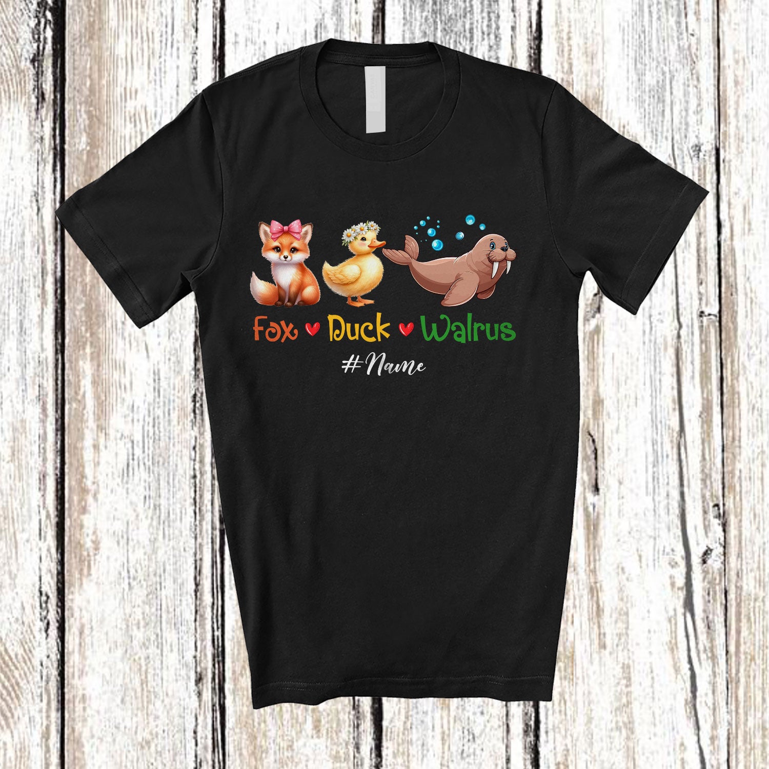 Personalized Custom Name Fox Duck Walrus; Adorable Wild Animal Farm Farmer Walrus Lover T-Shirt. This cotton t-shirt is a durable staple product with a classic fit. One of the most popular items, it has a relaxed style made for everyday and casual wear.