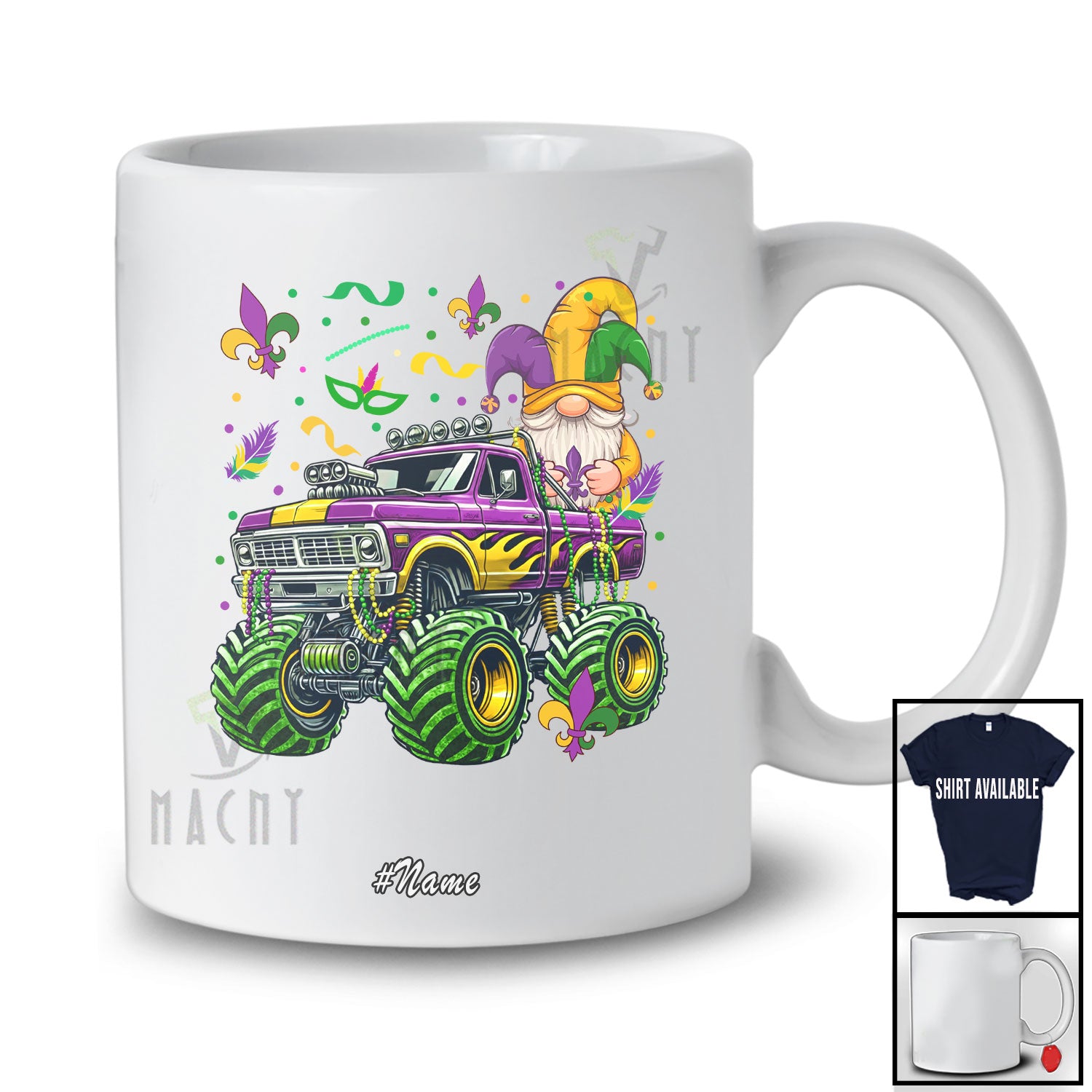 • Personalized Custom Name Gnome On Monster Truck; Lovely Mardi Gras Beads Monster Truck Driver T-Shirt. This cotton t-shirt is a durable staple product with a classic fit. One of the most popular items, it has a relaxed style made for everyday and casual wear.