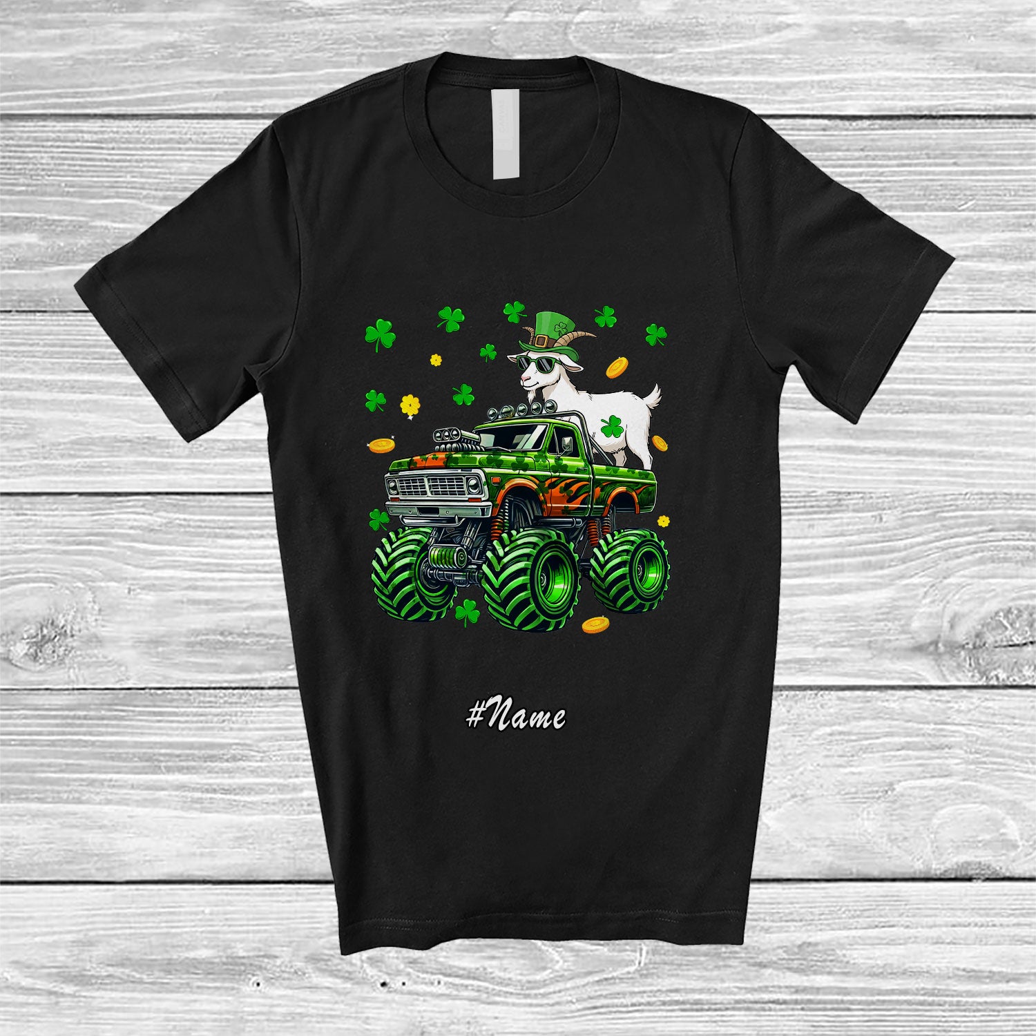 • Personalized Custom Name Goat On Monster Truck; Joyful St. Patrick's Day Shamrock Farm Animal T-Shirt. This cotton t-shirt is a durable staple product with a classic fit. One of the most popular items, it has a relaxed style made for everyday and casual wear.