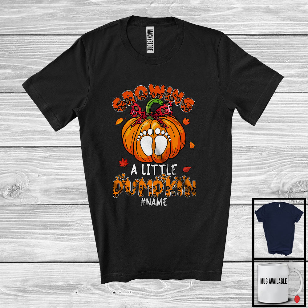 • Personalized Custom Name Growing A Little Pumpkin; Lovely Thanksgiving Leopard Pregnancy T-Shirt. This cotton t-shirt is a durable staple product with a classic fit. One of the most popular items, it has a relaxed style made for everyday and casual wear.