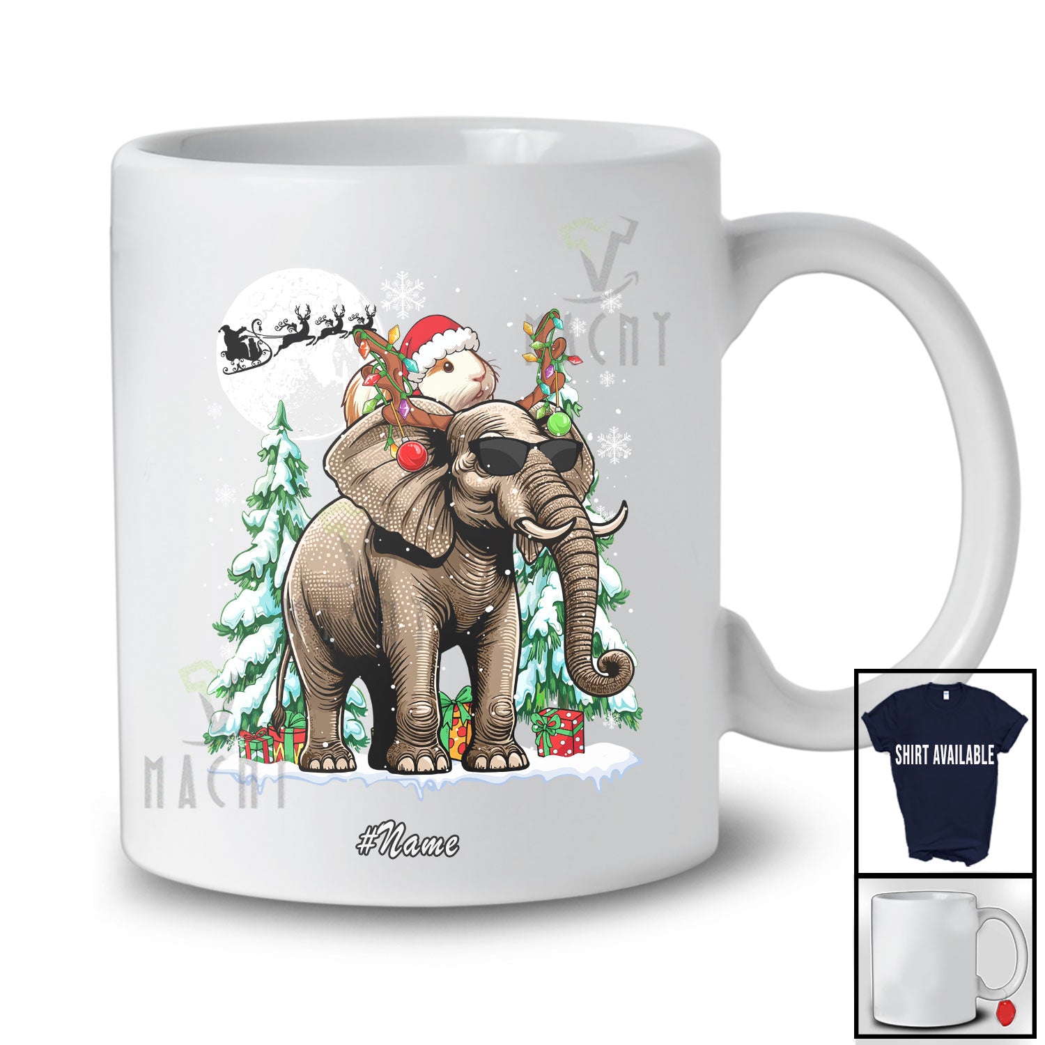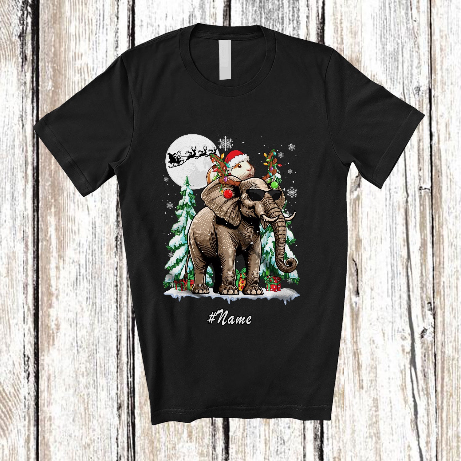 Personalized Custom Name Guinea Pig Riding Elephant Reindeer; Fantastic Christmas Trees Animal T-Shirt. This cotton t-shirt is a durable staple product with a classic fit. One of the most popular items, it has a relaxed style made for everyday and casual wear.