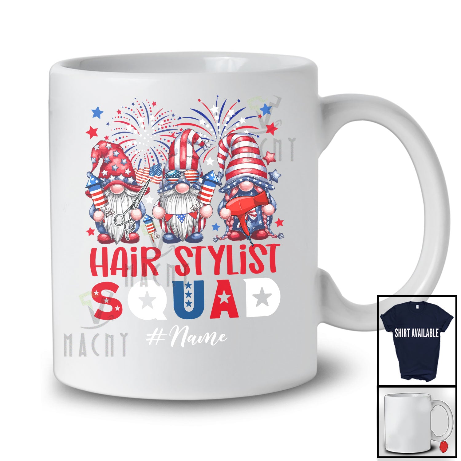 Personalized Custom Name Hair Stylist Squad; Adorable 4th Of July Three Patriotic Gnomes T-Shirt. This cotton t-shirt is a durable staple product with a classic fit. One of the most popular items, it has a relaxed style made for everyday and casual wear.
