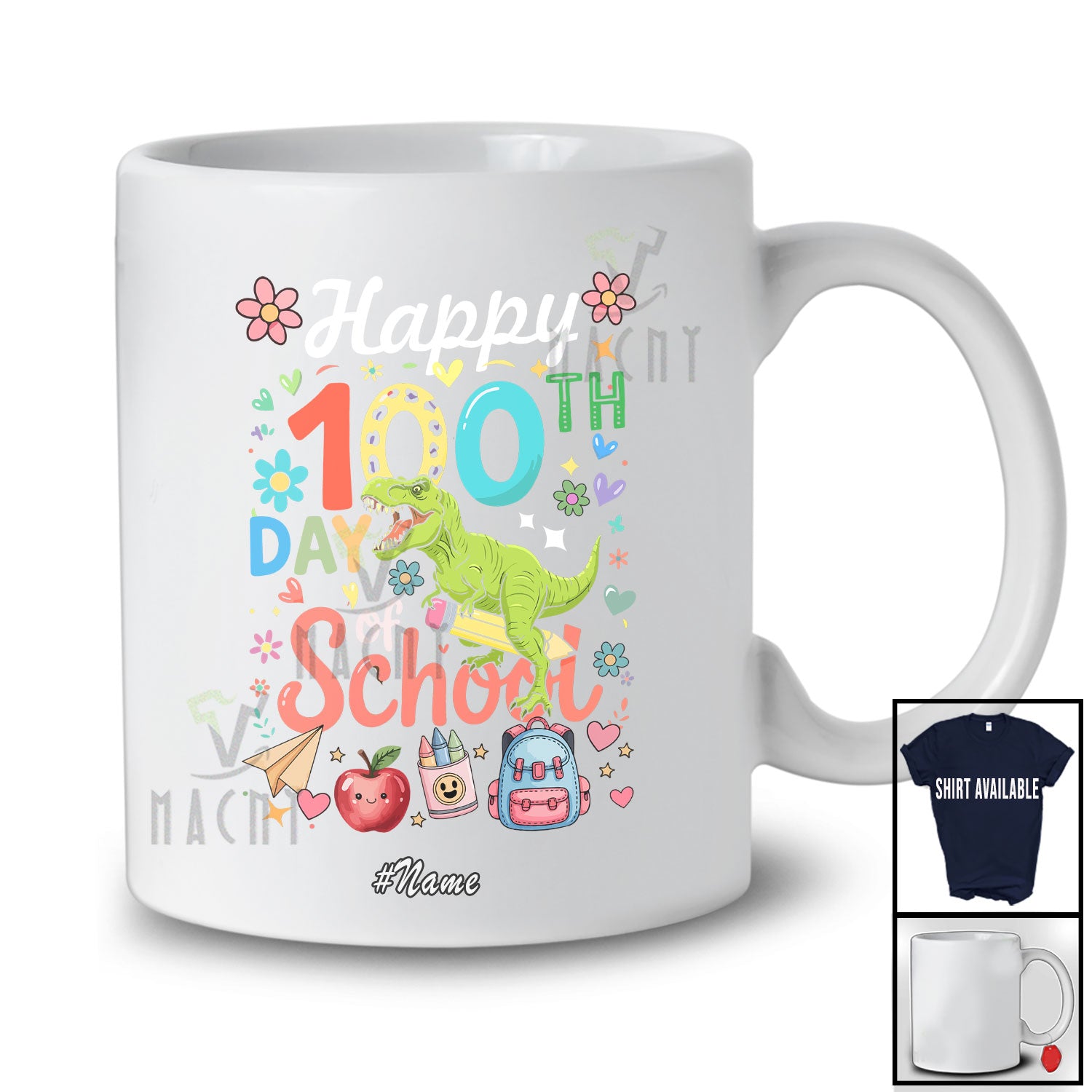 Personalized Custom Name Happy 100th Day Of School; Colorful 100 Days T-Rex Students Teacher T-Shirt. This cotton t-shirt is a durable staple product with a classic fit. One of the most popular items, it has a relaxed style made for everyday and casual wear.