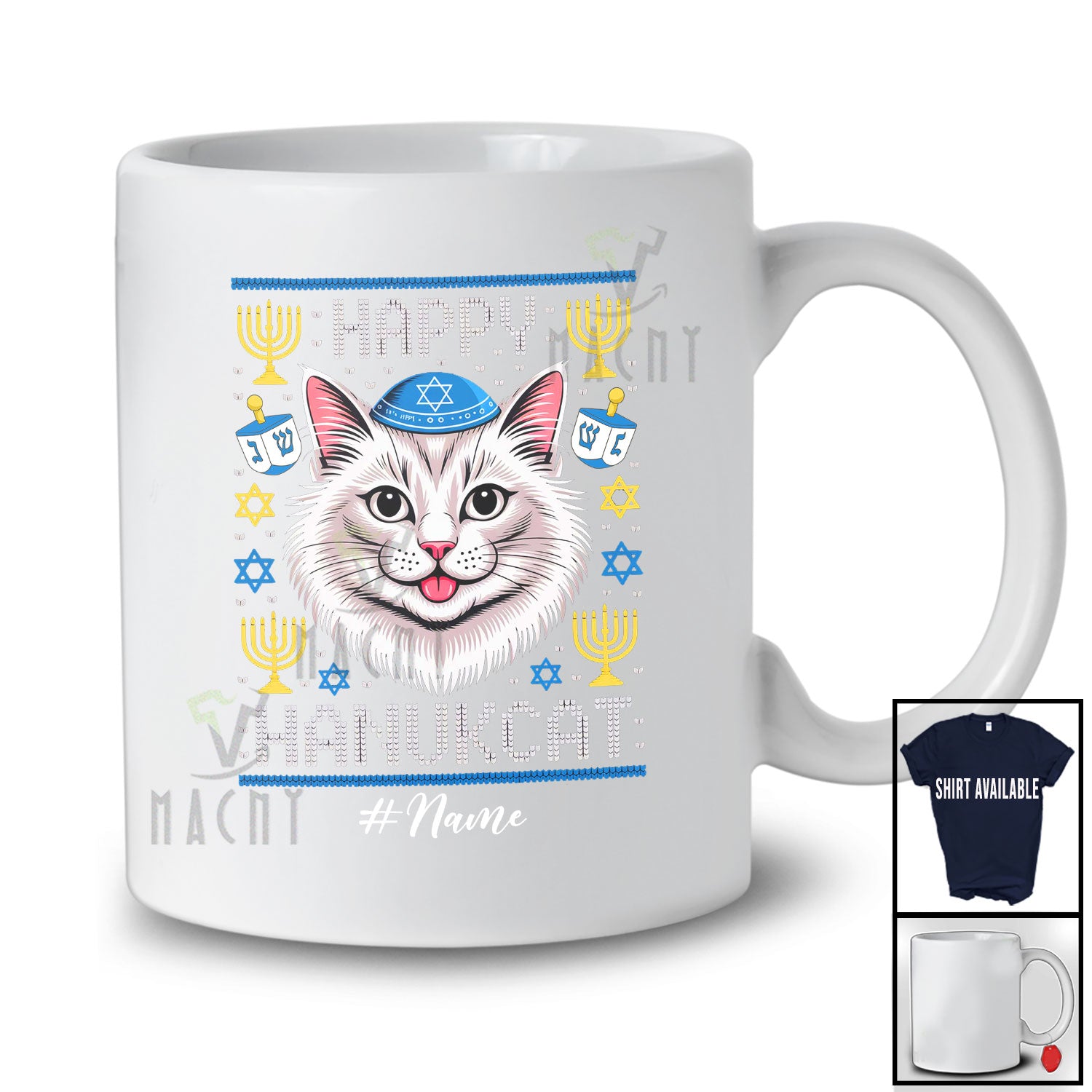 Personalized Custom Name Happy Hanukcat; Humorous Hanukkah Sweater Cat Face Lover T-Shirt. This cotton t-shirt is a durable staple product with a classic fit. One of the most popular items, it has a relaxed style made for everyday and casual wear.