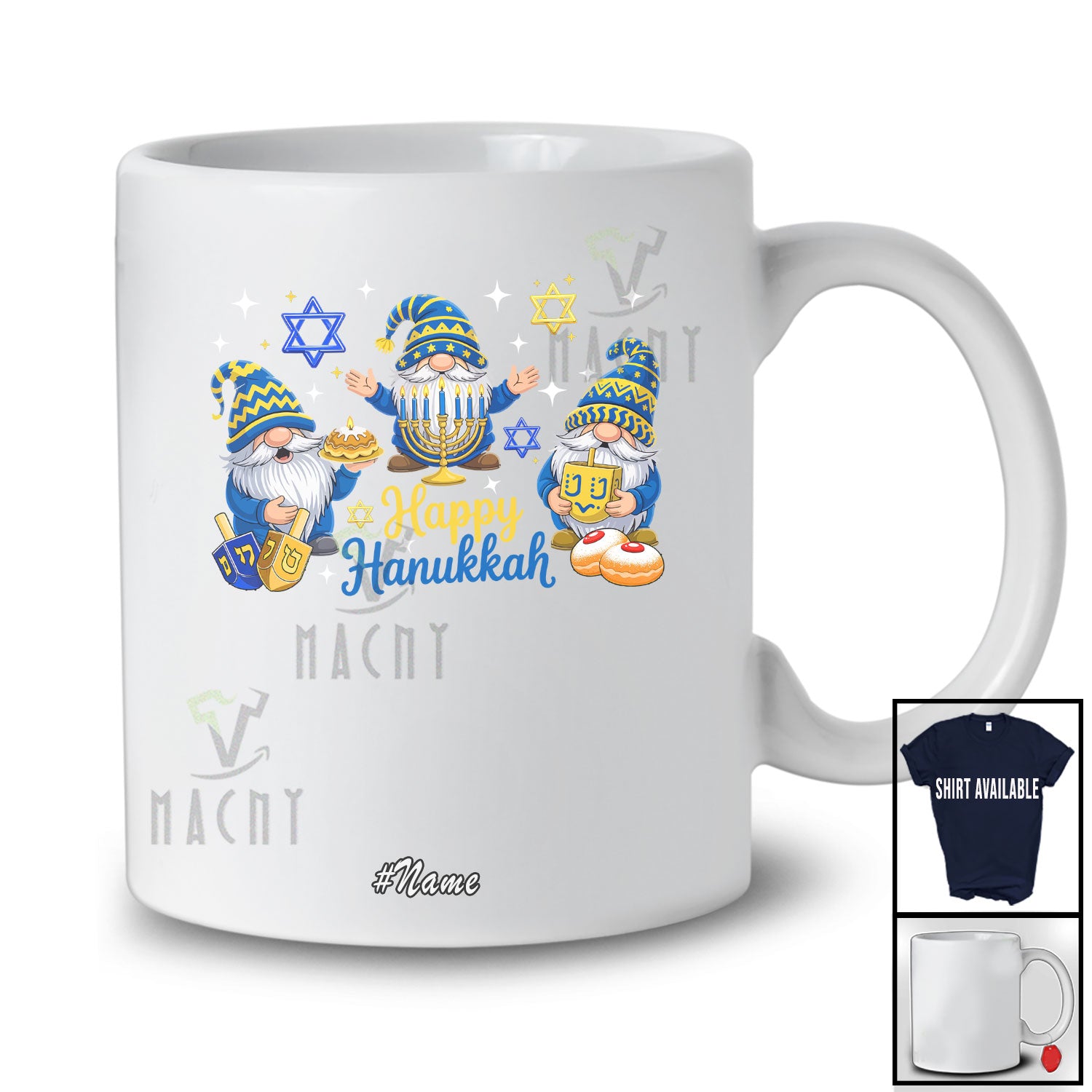 Personalized Custom Name Happy Hanukkah; Amusing Chanukah Lights Three Gnomes Gnomies T-Shirt. This cotton t-shirt is a durable staple product with a classic fit. One of the most popular items, it has a relaxed style made for everyday and casual wear.