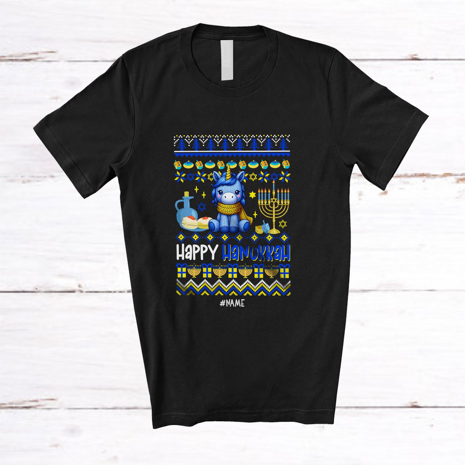 Personalized Custom Name Happy Hanukkah; Lovely Chanukah Sweater Lights Unicorn T-Shirt