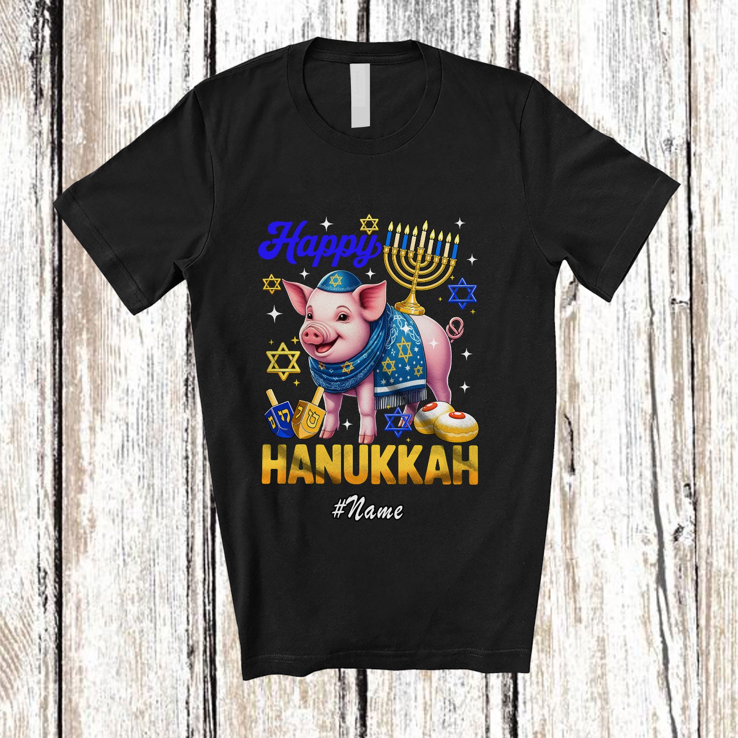 Personalized Custom Name Happy Hanukkah; Lovely Hanukkah Lights On Pig Farming; Farmer Family T-Shirt. This cotton t-shirt is a durable staple product with a classic fit. One of the most popular items, it has a relaxed style made for everyday and casual wear.