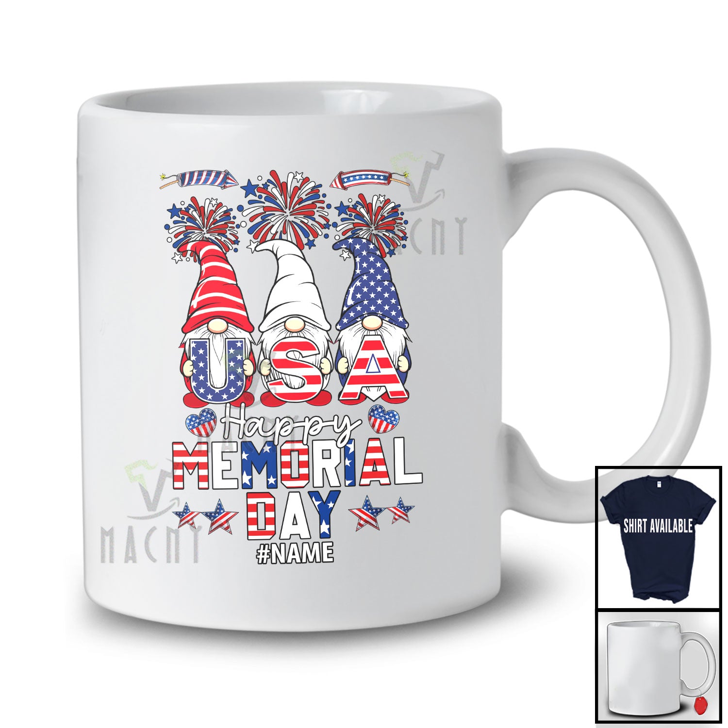 Personalized Custom Name Happy Memorial Day; Awesome 4th of July 3 Gnomes Patriotic US Flag T-Shirt. This cotton t-shirt is a durable staple product with a classic fit. One of the most popular items, it has a relaxed style made for everyday and casual wear.