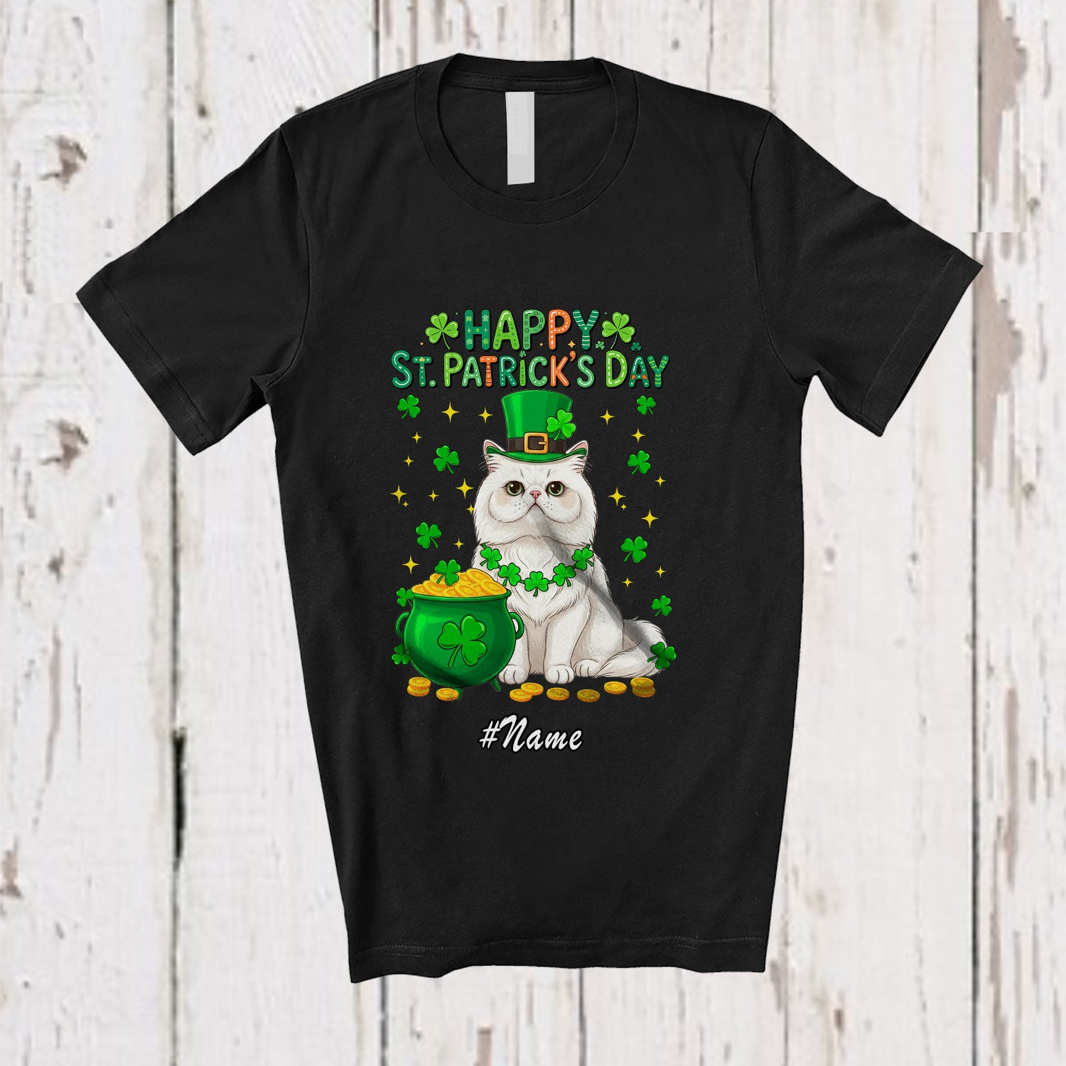 Personalized Custom Name Happy St. Patrick's Day; Adorable Irish Shamrock Persian Cat Owner T-Shirt. This cotton t-shirt is a durable staple product with a classic fit. One of the most popular items, it has a relaxed style made for everyday and casual wear.