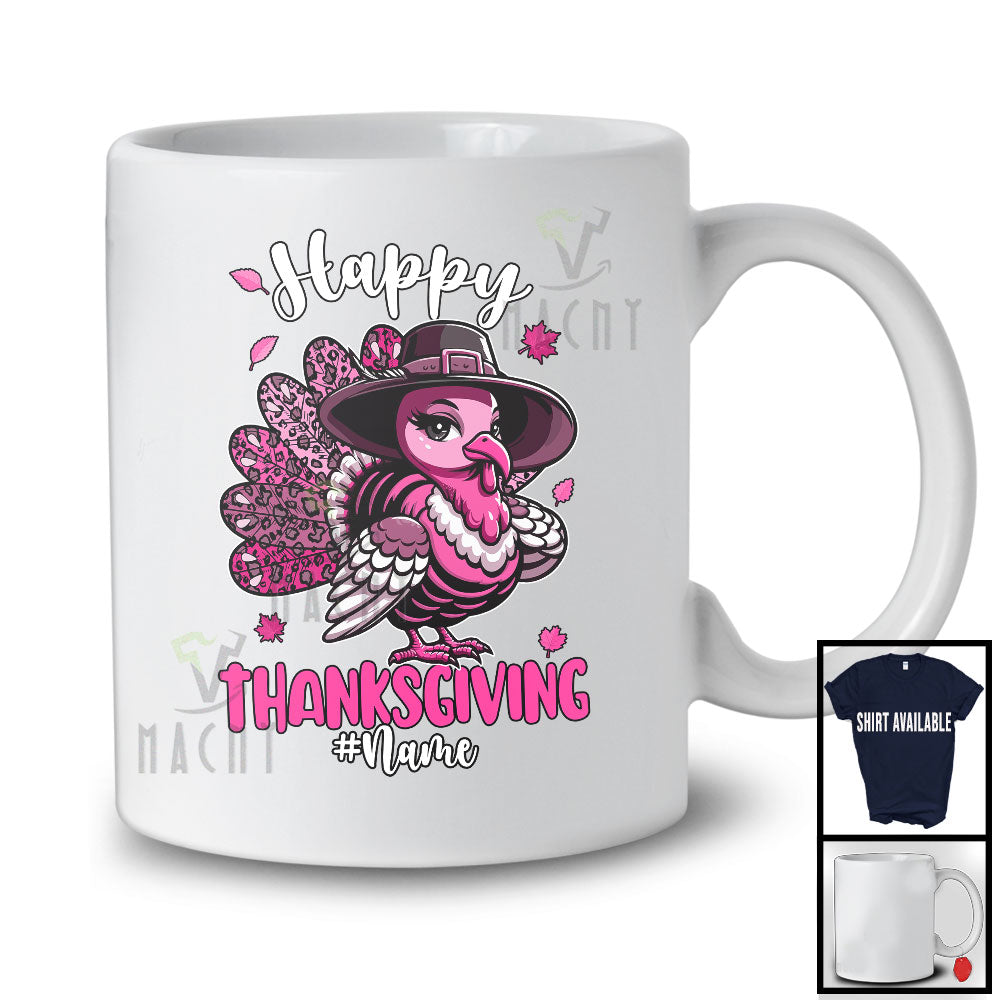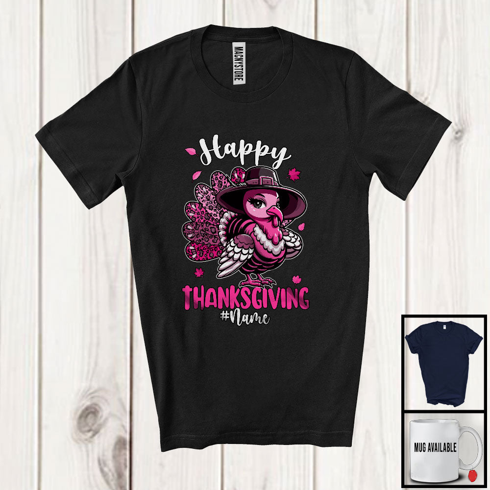 Personalized Custom Name Happy Thanksgiving; Humorous Pink Turkey Pilgrim; Women Family T-Shirt. This cotton t-shirt is a durable staple product with a classic fit. One of the most popular items, it has a relaxed style made for everyday and casual wear.