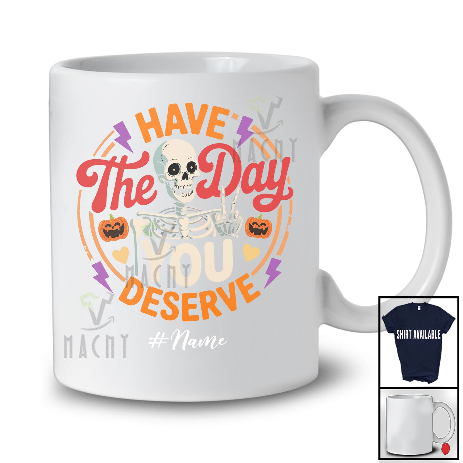 Personalized Custom Name Have The Day You Deserve; Scary Halloween Costume Skeleton Lover T-Shirt. This cotton t-shirt is a durable staple product with a classic fit. One of the most popular items, it has a relaxed style made for everyday and casual wear.