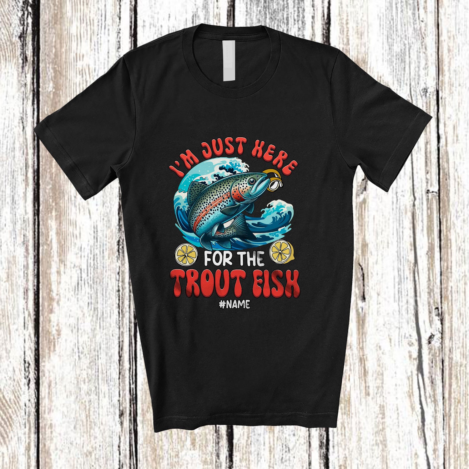 The Personalized Custom Name Here For The Trout Fish; Humorous Seafood Boil Party Fishing Food T-Shirt destined to impress, and priced at only $12.95, for a limited time.
