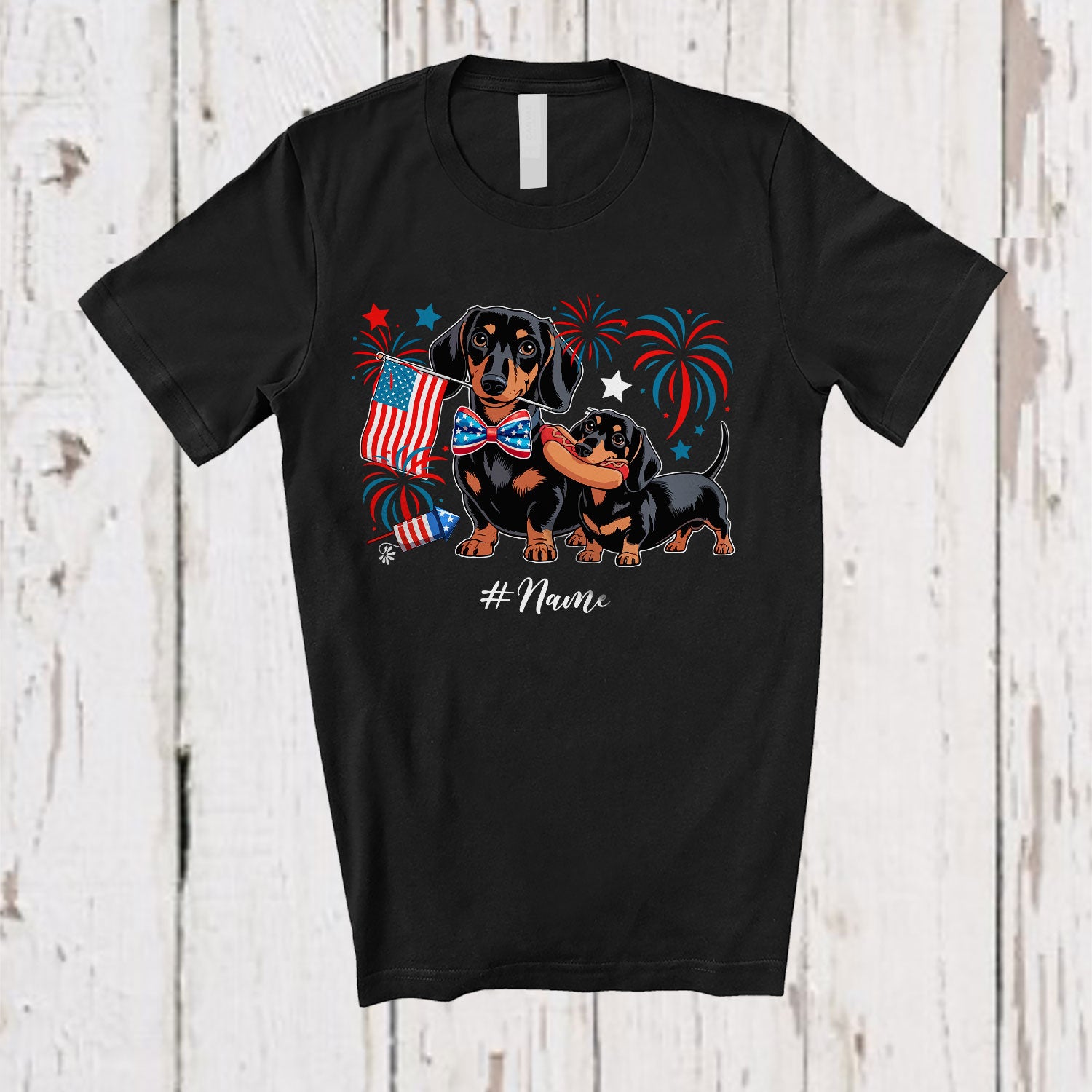 • Personalized Custom Name Hotdog Dachshund Dad Sausage; Humorous 4th of July Patriotic T-Shirt. This cotton t-shirt is a durable staple product with a classic fit. One of the most popular items, it has a relaxed style made for everyday and casual wear.