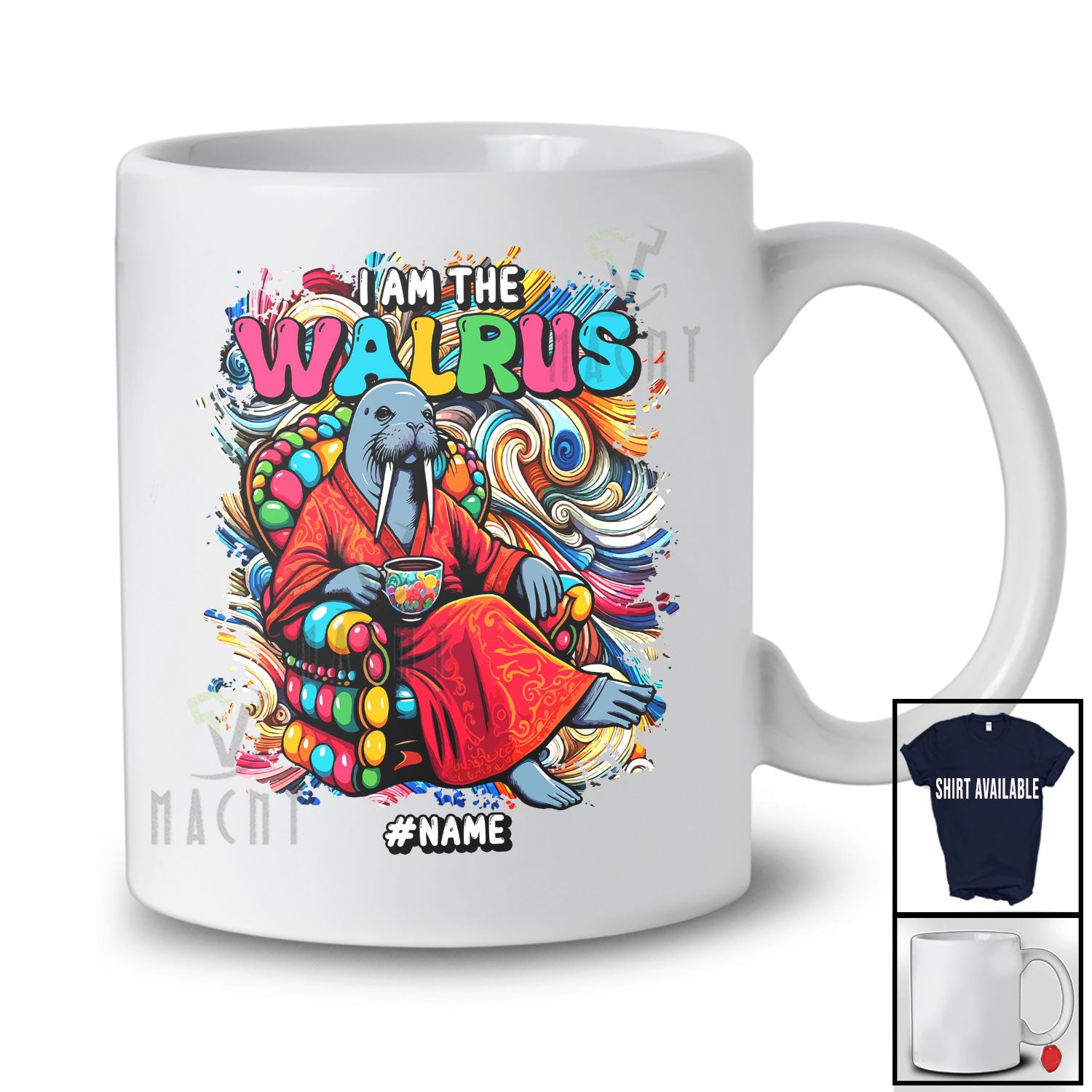 Personalized Custom Name I Am The Walrus; Colorful Power Walrus Drinking Coffee Sea Animal T-Shirt. This cotton t-shirt is a durable staple product with a classic fit. One of the most popular items, it has a relaxed style made for everyday and casual wear.