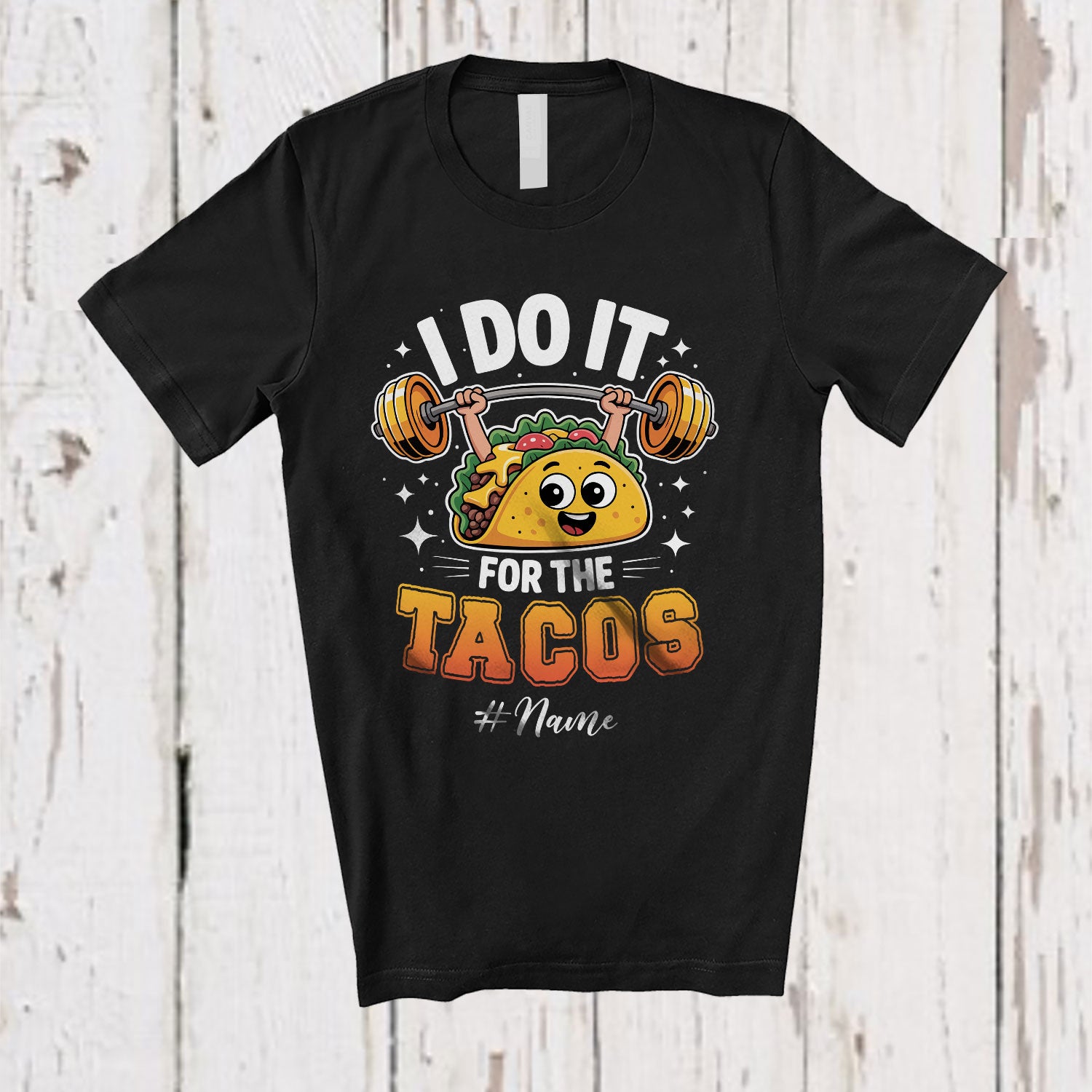 • Personalized Custom Name I Do It For Tacos; Amusing Taco Gym Weightlifting Workout T-Shirt. This cotton t-shirt is a durable staple product with a classic fit. One of the most popular items, it has a relaxed style made for everyday and casual wear.