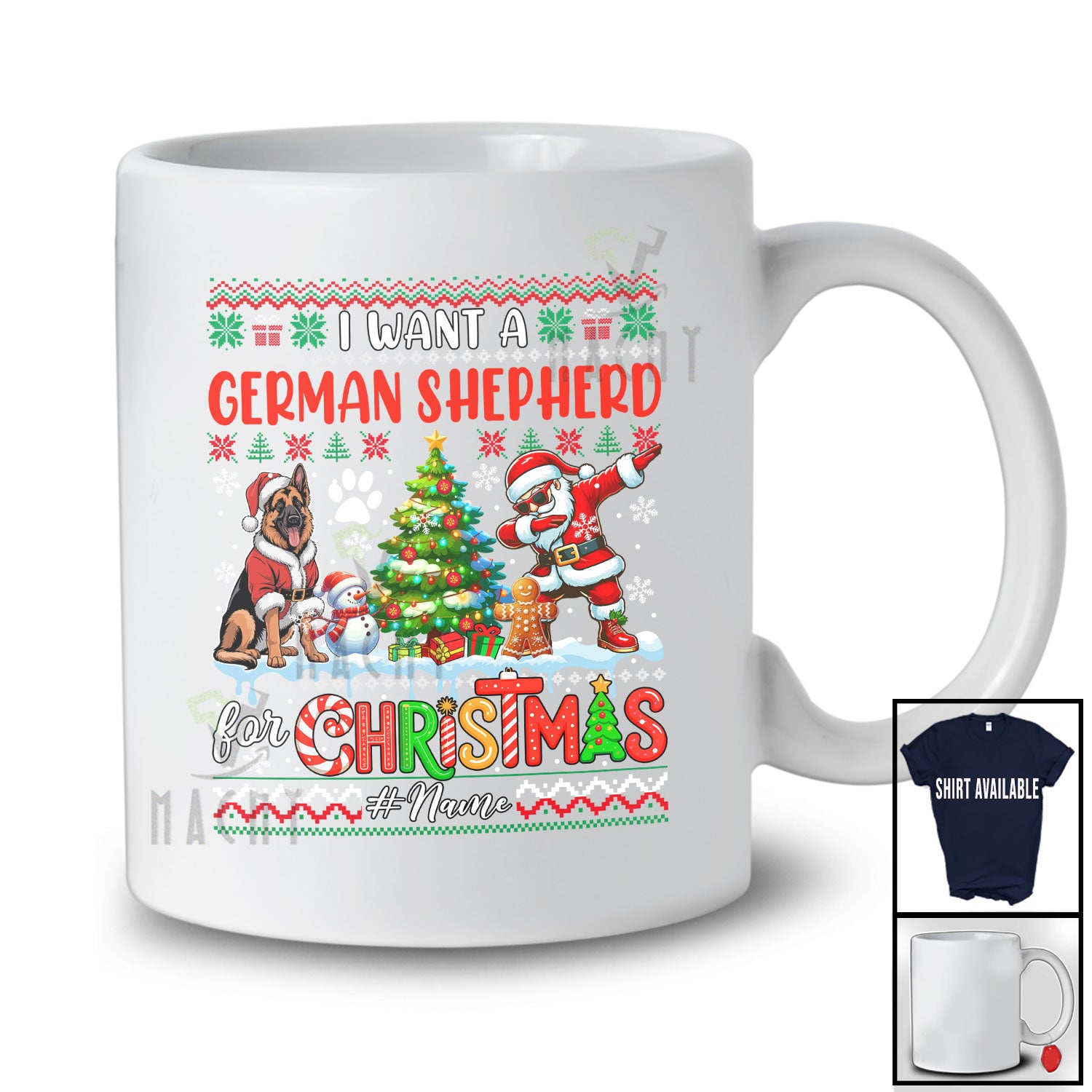 • Personalized Custom Name I Want A German Shepherd For Christmas; Joyful Sweater Dabbing Santa T-Shirt. This cotton t-shirt is a durable staple product with a classic fit. One of the most popular items, it has a relaxed style made for everyday and casual wear.