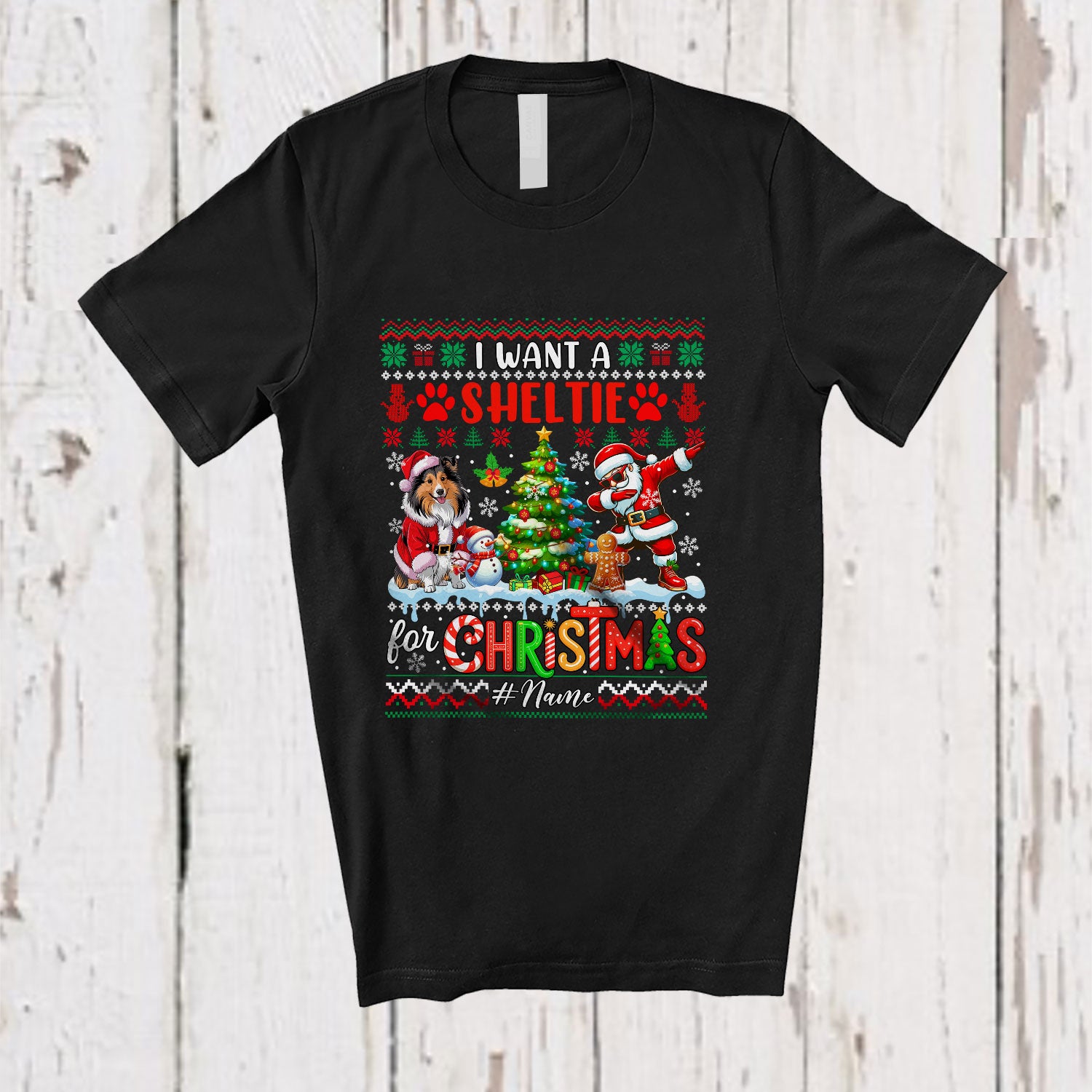 • Personalized Custom Name I Want Shelties For Christmas; Cheerful Sweater Dabbing Santa T-Shirt. This cotton t-shirt is a durable staple product with a classic fit. One of the most popular items, it has a relaxed style made for everyday and casual wear.