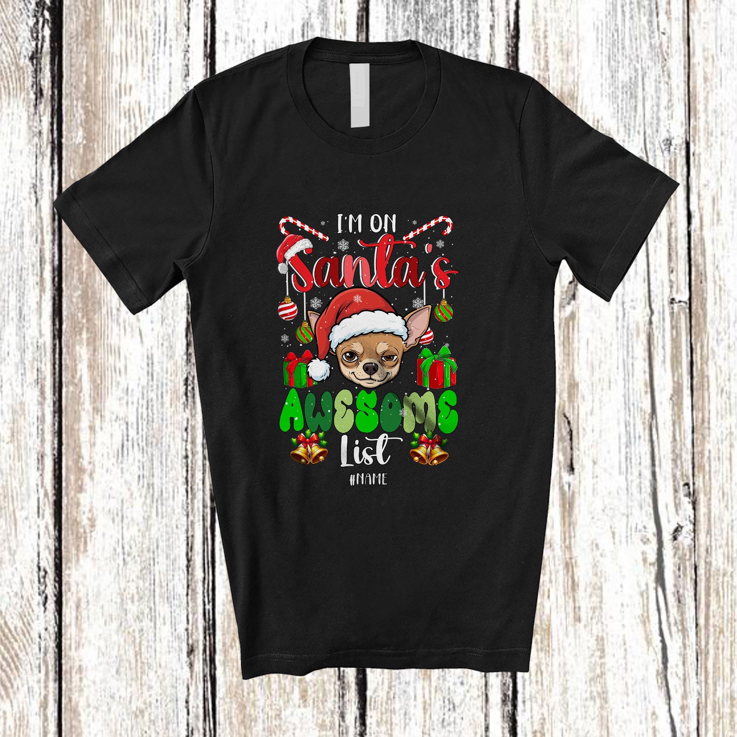Personalized Custom Name I'm On Santa's Awesome List; Amazing Christmas Santa Chihuahua Face T-Shirt