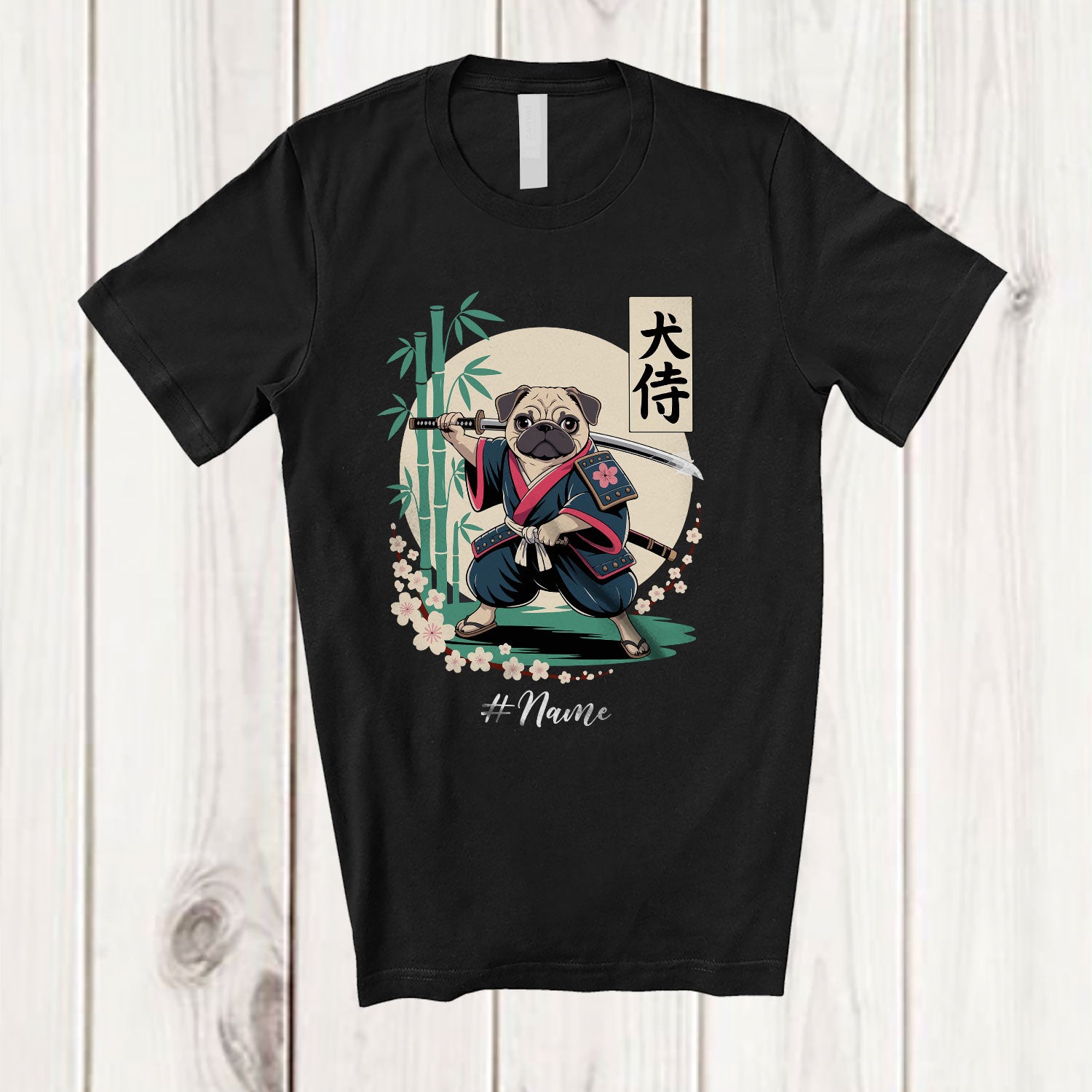 Personalized Custom Name Japanese Samurai Pug; Adorable Kawaii Japan Pug Martial Arts T-Shirt