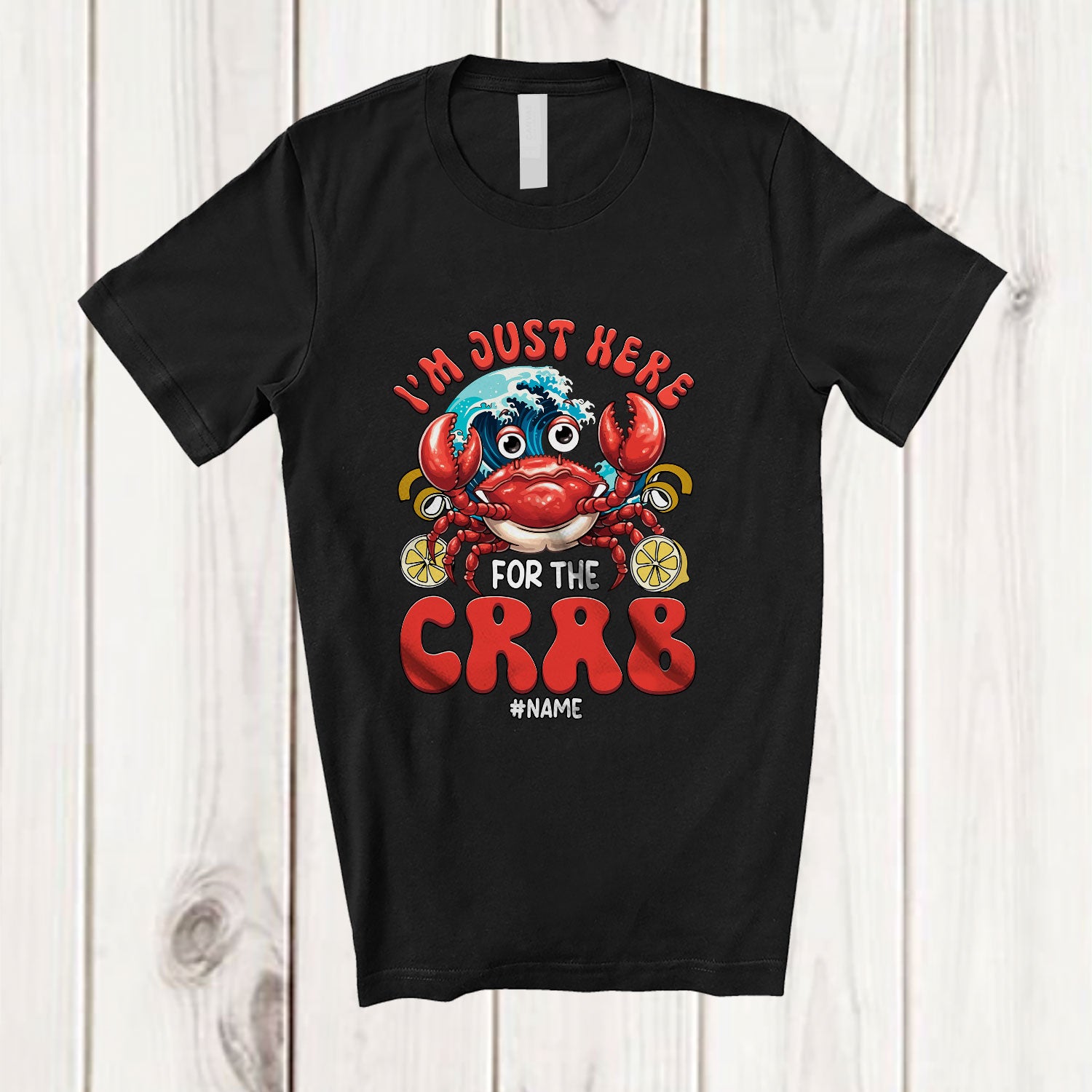 • Personalized Custom Name Just Here For The Crab; Humorous Seafood Boil Party Fishing Food T-Shirt. This cotton t-shirt is a durable staple product with a classic fit. One of the most popular items, it has a relaxed style made for everyday and casual wear.