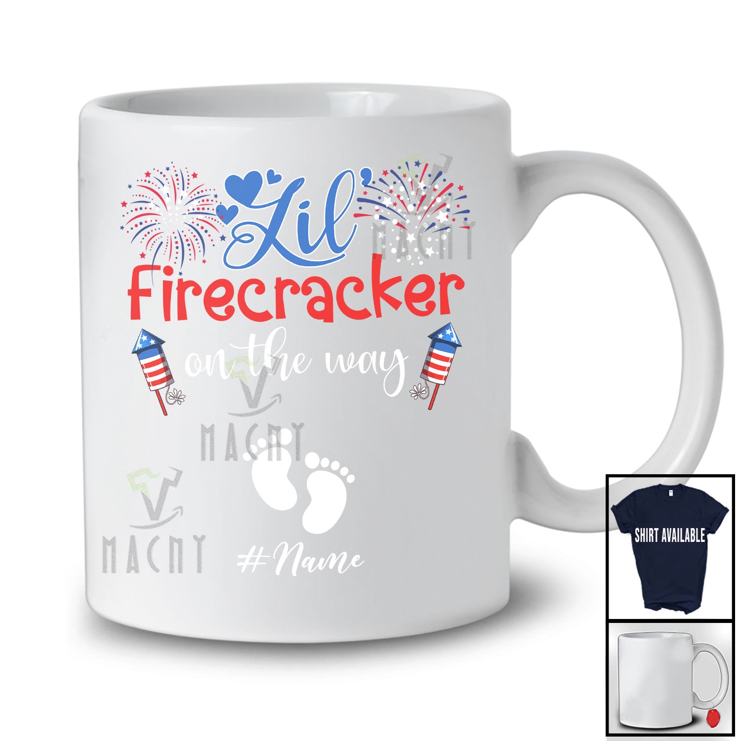 Personalized Custom Name Lil' Firecracker On The Way; Amusing 4th Of July Pregnancy; Patriotic T-Shirt. This cotton t-shirt is a durable staple product with a classic fit. One of the most popular items, it has a relaxed style made for everyday and casual wear.