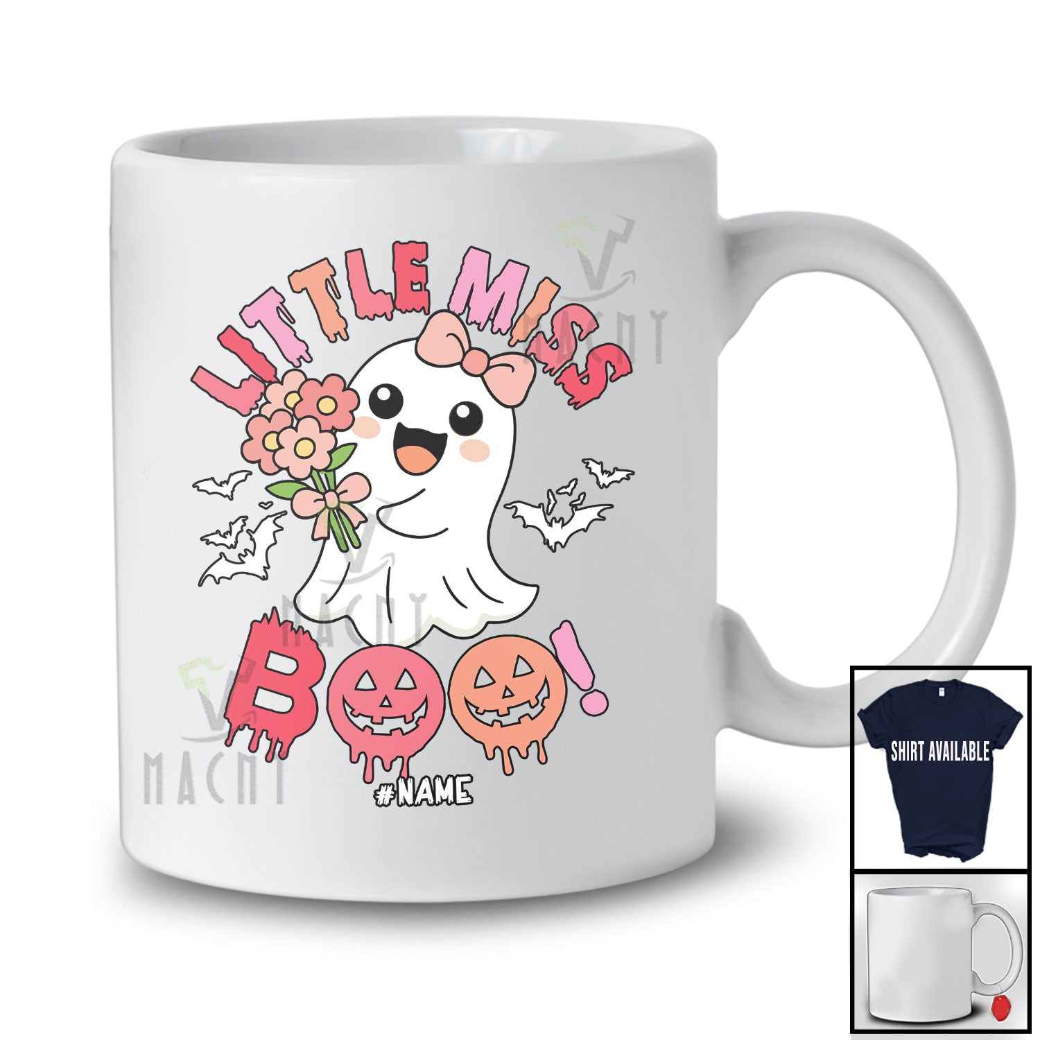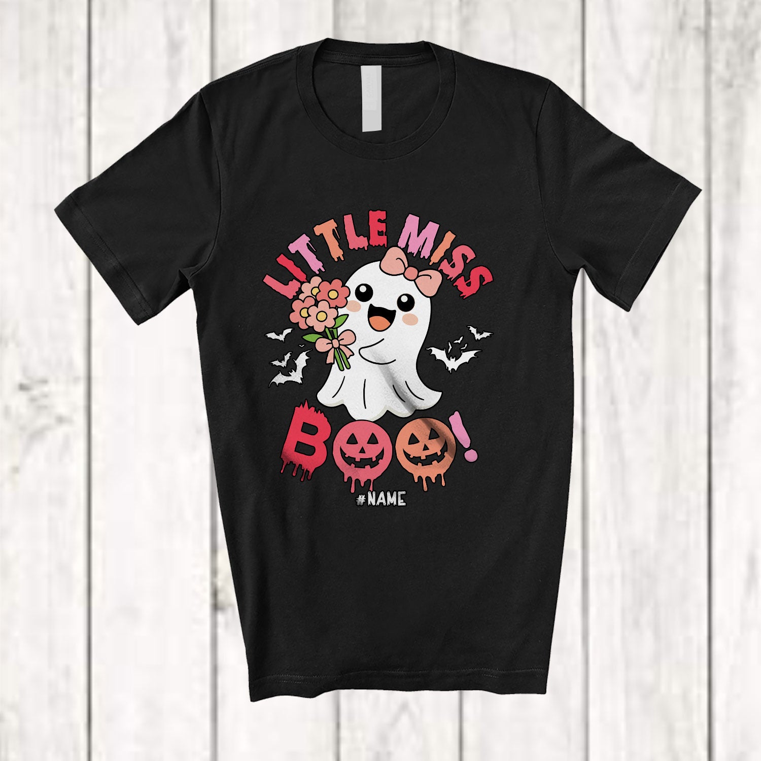 Personalized Custom Name Little Miss Boo; Joyful Halloween Beautiful Ghost Flowers; Family T-Shirt. This cotton t-shirt is a durable staple product with a classic fit. One of the most popular items, it has a relaxed style made for everyday and casual wear.