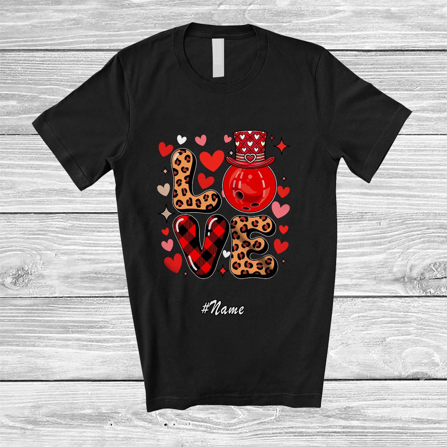 • Personalized Custom Name LOVE; Amusing Valentine Red Leopard Plaid Bowling Player Couple T-Shirt. This cotton t-shirt is a durable staple product with a classic fit. One of the most popular items, it has a relaxed style made for everyday and casual wear.