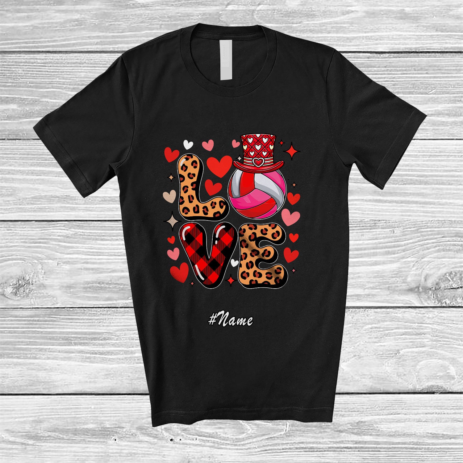 Personalized Custom Name LOVE; Amusing Valentine Red Leopard Plaid Volleyball Player Couple T-Shirt