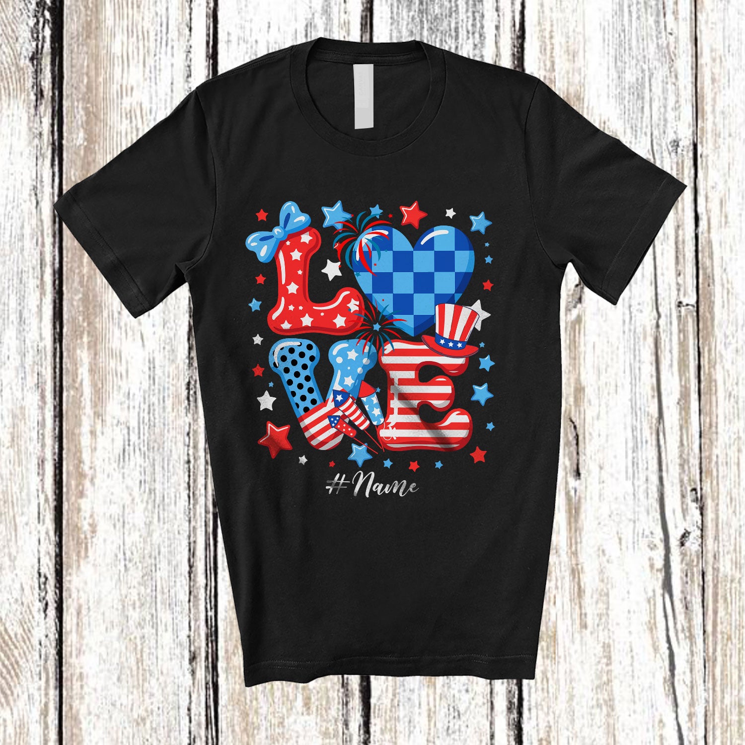 Personalized Custom Name LOVE; Awesome 4th of July American Flag Heart Firecracker; Patriotic T-Shirt